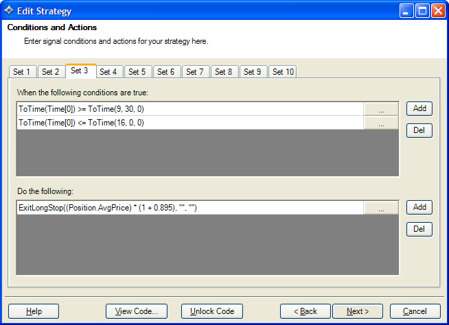 OK thanks for walking me through this -- I'm thinking this is going to do what I'm looking for. Please see the two attached images -- after filling out Set 1 and Set 2 for my Long and Short entries I''m using Set 3 to create my 10.5% stop loss. Please check me on the numbers -- will .895 the way I have it give me a 10.5% stop loss from the entry price? Then I have the time rules above so that the stop will only be in effect during mkt hours (my computer is set to EST. How does this look?