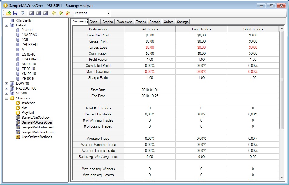 I checked SampleMACrossOver but still i cant see the summary. I can see the graph and MA's on it. But when i want to see the results of the strategy there is still nothing.