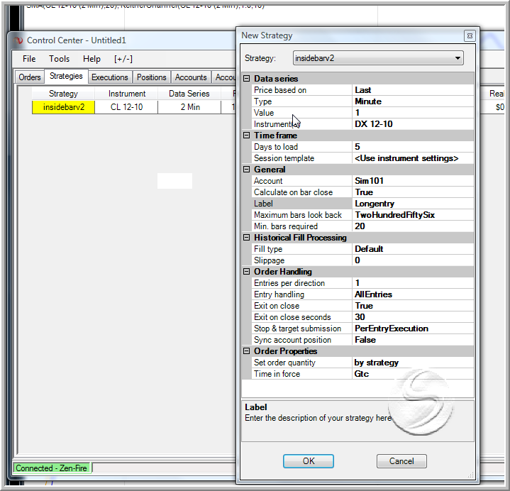 OK, got the session time straightened out. Now, another issue, when I to the strategy tab in control center and right click to add a new strategy, first I get a blank window as seen in the attachment.(insidebar). I then choose a different strategy like "longentry" and all the contents of the window appear. I then switch back to "insidebarv2" at shown in the second attachment (insidebar2), but the label row under General stays at "longentry". Why is does this happen? I have to manually type in "insidebarv2" in order for the correct strategy to apply.
