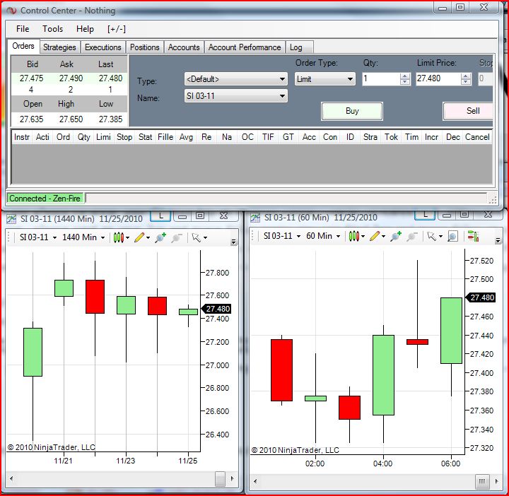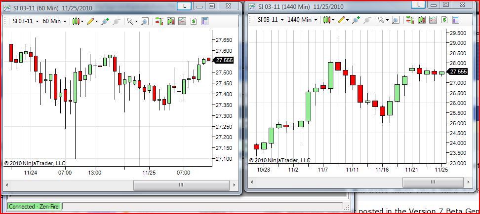 I just switched from the 12/10 SI contract to 03/11, but when I switch from 5 min chart to 30 min chart, the price changes from 27.64 to 27.57 respectively. I have disconnected, shut down NT and reconnected and repaired the DB, but the problem still remains.
