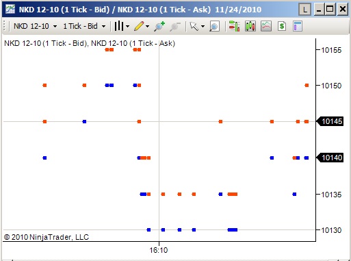 You can plot the bid & ask price to the chart using NinjaTrader 7. (see screenshot) For example the Nikkei 225 future: I plotted the bid as one data series & the ask as the secondary data series and simply combined them on to the same ‘panel’. Volumes were on the “light” side but the concept is there. I realize it’s not ideal but perhaps it serves as a jumping off point for constructing a spread-type indicator.