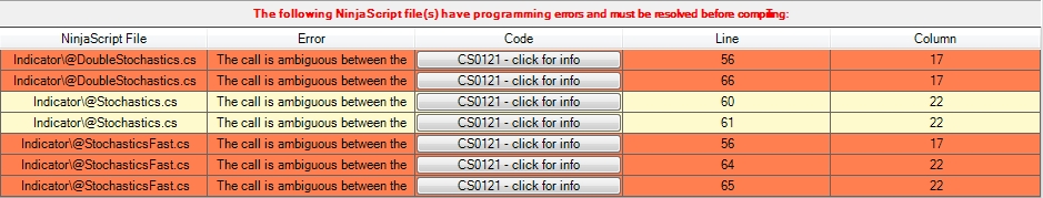 I've been using NinjaTrader v7.0.0.23 while getting ready for the final release. Today, I installed v7.0.1000 over the prior version in which there weren't any compile errors. On opening the productin version, get an error message that there were compile errors. When I manually try to compile the scrips I get compile errors for the following indicators: @DoubleStochastics.cs, @Sochastics.cs and @StochasticsFast.cs. Since I use the Stochastics indicator on my charts none of the indicators on any charts will load in the new version. Find attached a screenprint of the error.Tags: None