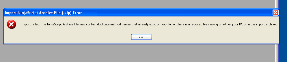 Yes, the import failed but what do it mean "the ninjascript archive file may contain duplicate method names that already exist on your PC"?