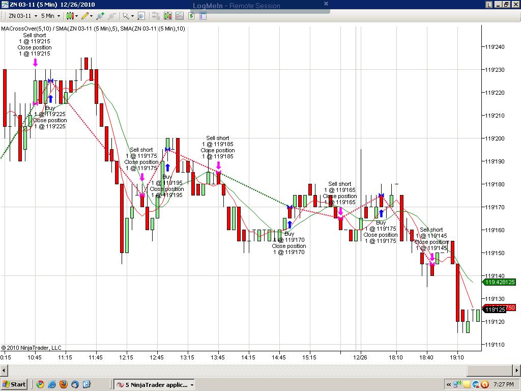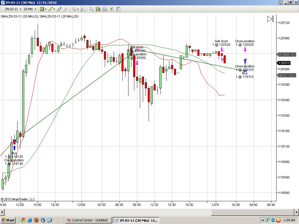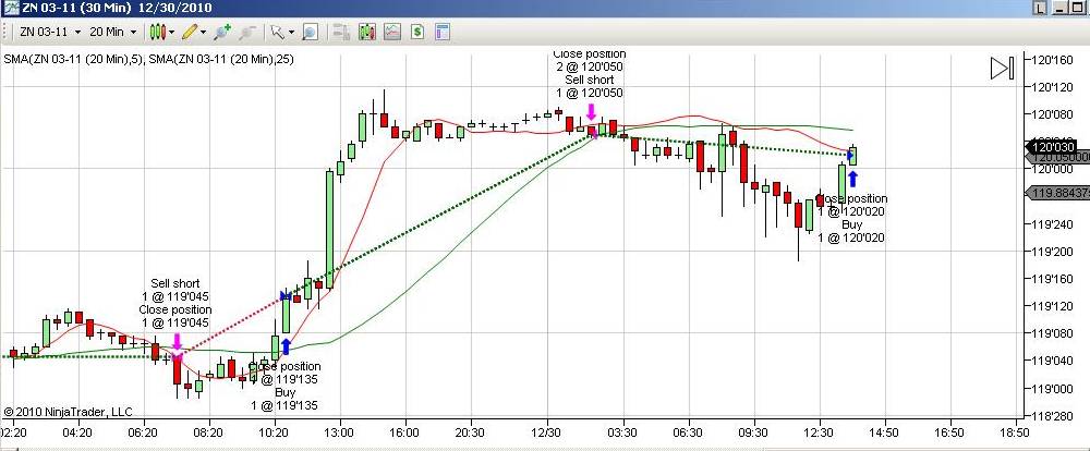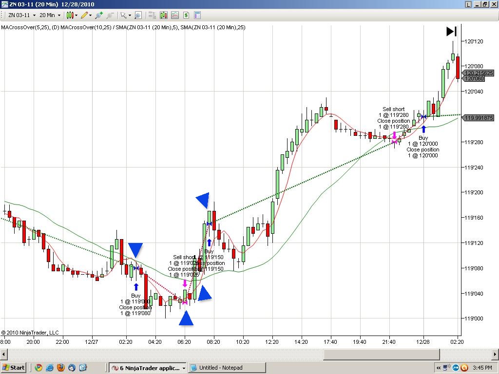 Could the chart be screwing up? Minimum bars = 1, MA = 5,25. The 1st 2 trades look correct, the 2nd to the last should not have happened looking at the 1 minute chart there is no way that a 20min moving average crossed over on that bar. The last one is in the future. If its correct then I have found the Holy Grail.