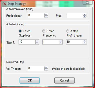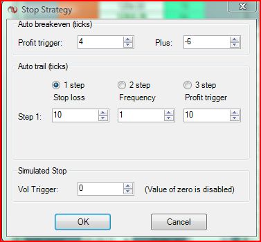 Subsequently you will use a profit trigger of 10 for your AutoTrail. However if you leave 'Stop loss' to 10 as well, the stop loss will not adjust. Because at 10 ticks in profit, the stop loss is adjusted to 10 ticks behind the market price, which is breakeven as well. However you already adjusted the stop loss to breakeven at 4 ticks in profit using the Auto Breakeven.