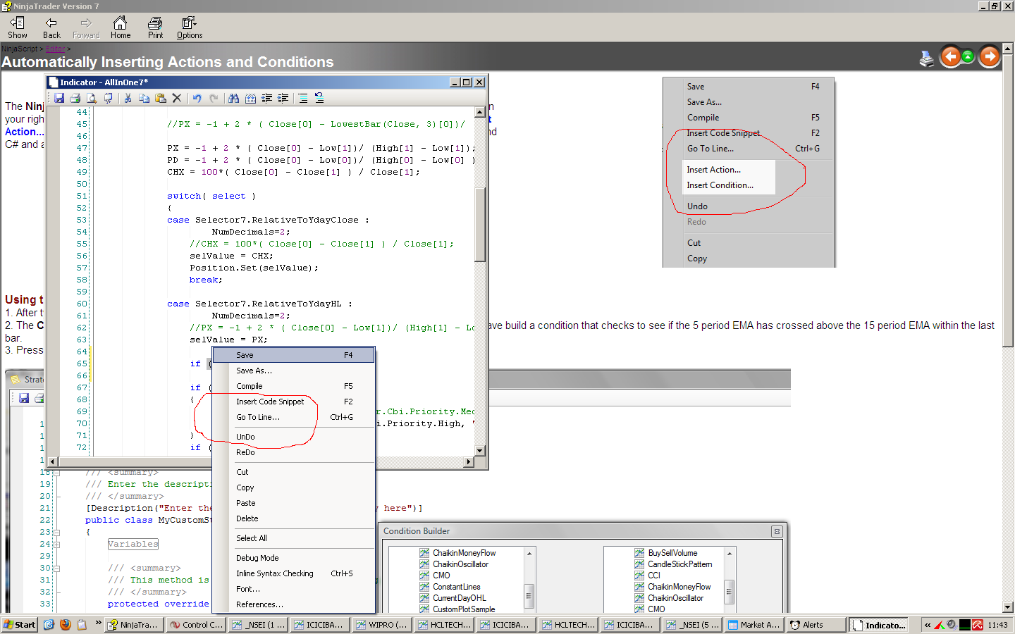 In my NinjaScript editor, I do not find the right click options 'Insert Action.....' and 'Insert Condition.....' as given in the NT7 Help file. My NT version is 7.0.1000.1