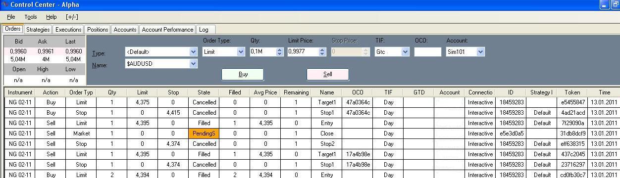 (1) If I open a position with the NinjaTrader default symbol mapping, the position is opened for the false contract month. This is a known problem, so I changed the symbol mapping to NG||||1.