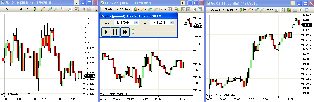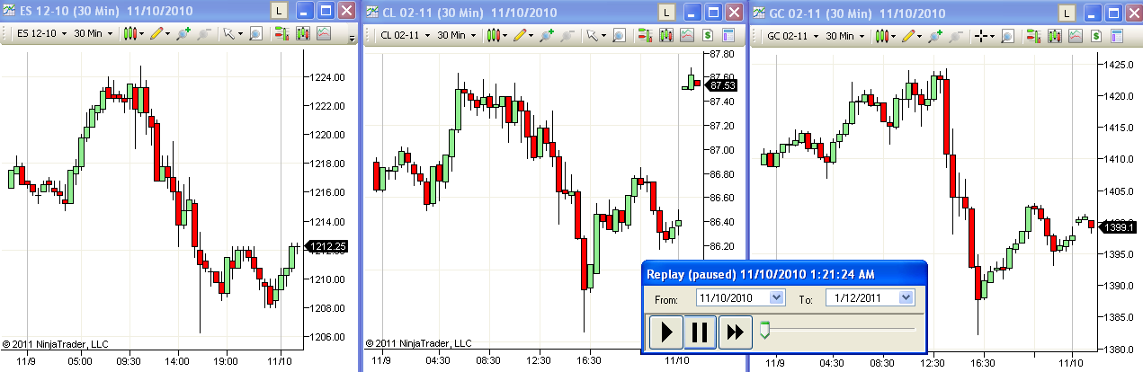 First screen shot starts Nov 9; see how CL and GC jump up at midnight. Start the replay on Nov10 and Nov 9 data does not show a jump at midnight.