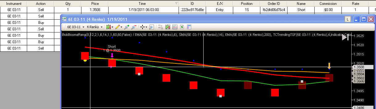 Observation: I reran and at 6:03 (1.3508)it entered the short as expected At 6:08.13 it hit my target of 8 ticks profit (1.3500)but as we know it did not close the position as it should of.