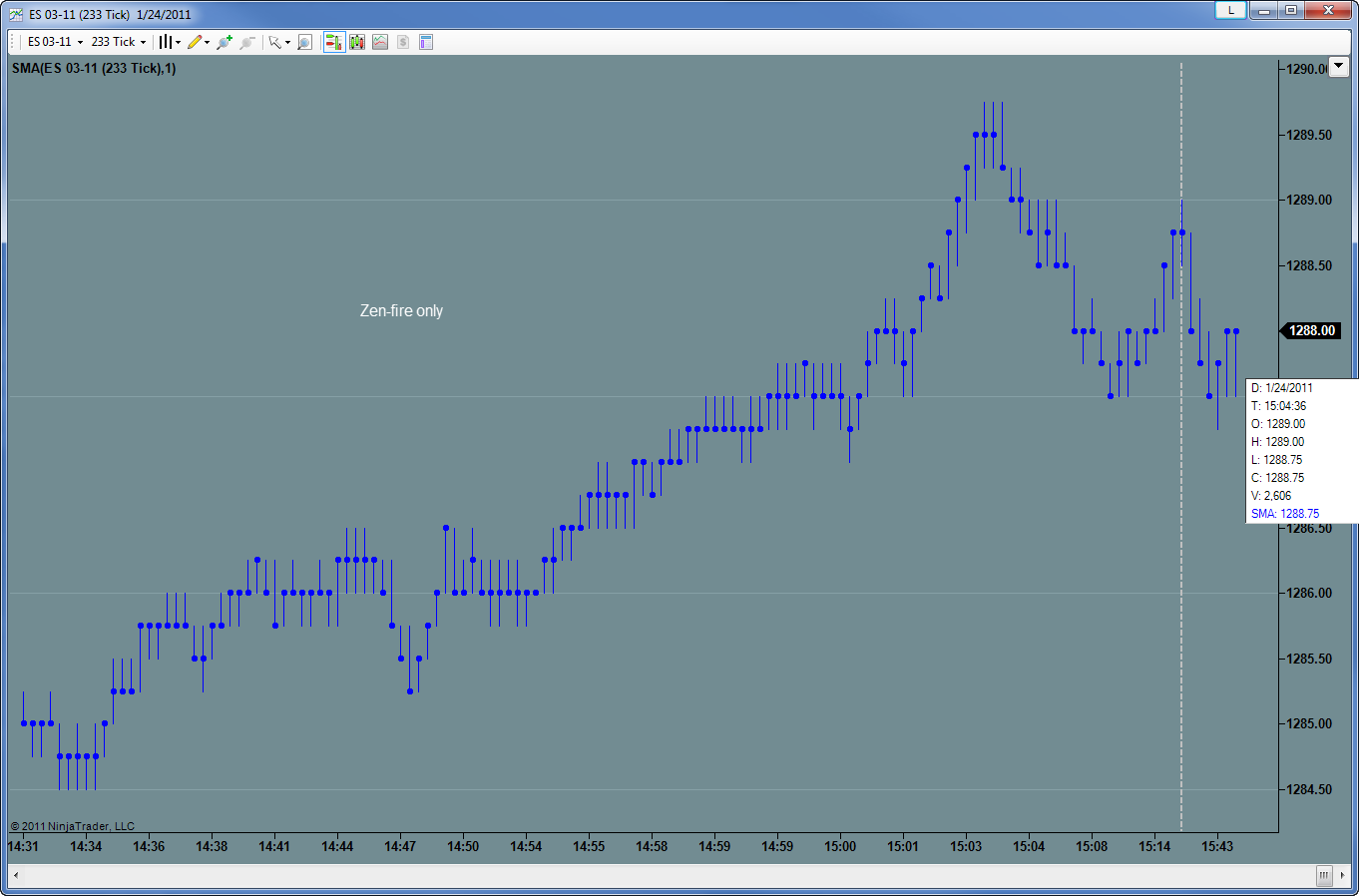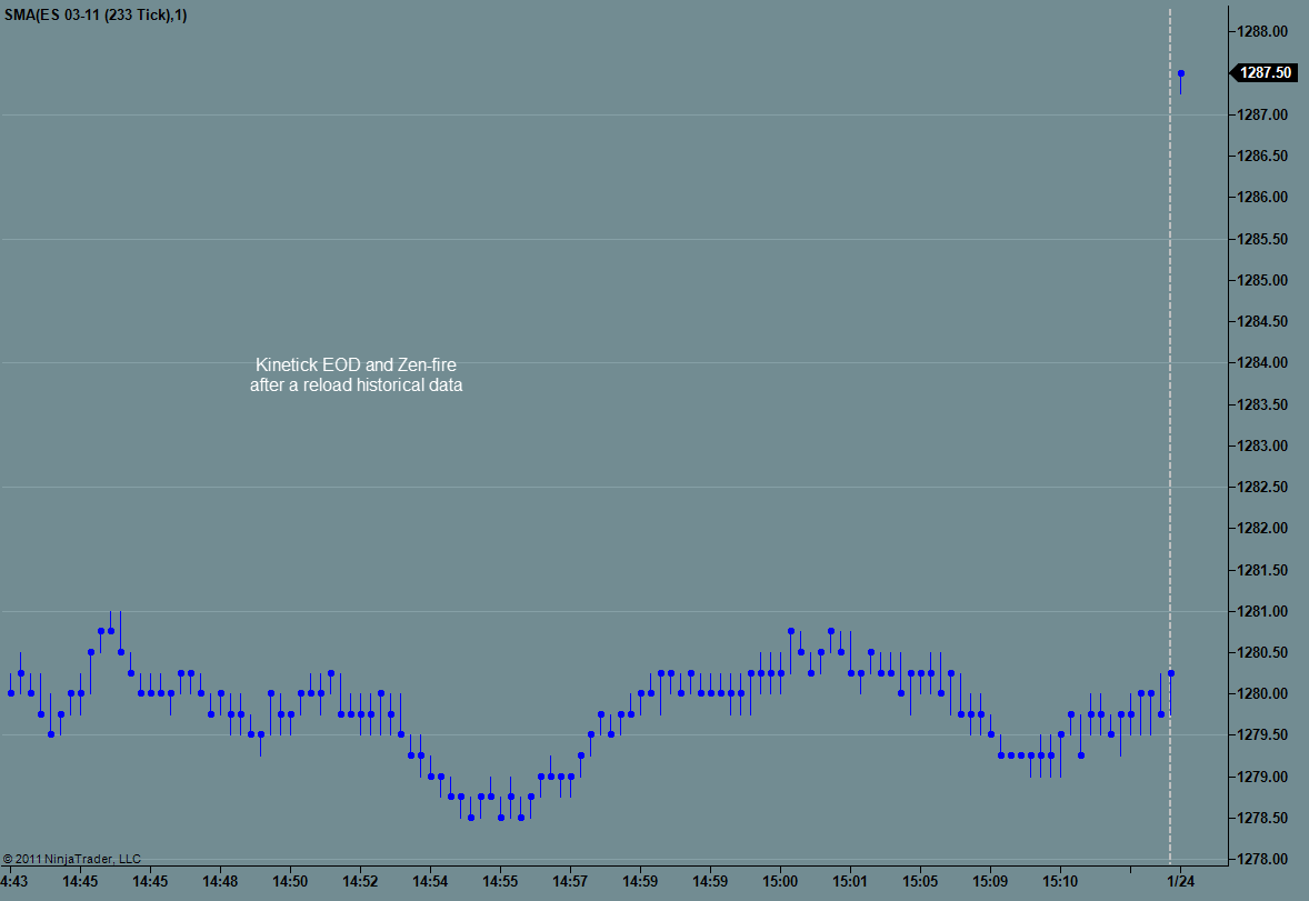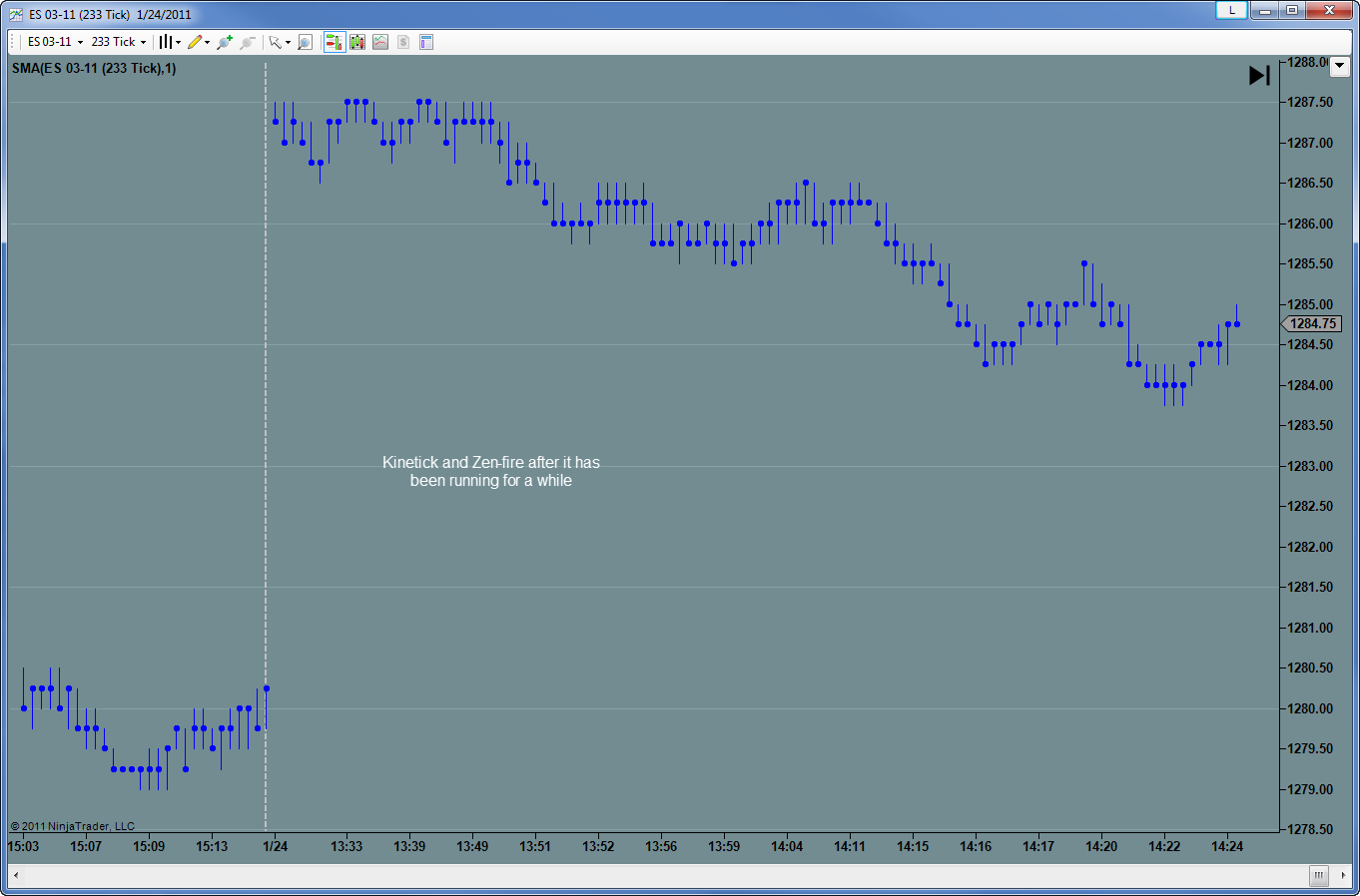 When I put Kinetick first my 233 tick chart is not correct. I get a big bar around the time I start the chart that represents multiple bars when I run Zen-fire by itself.