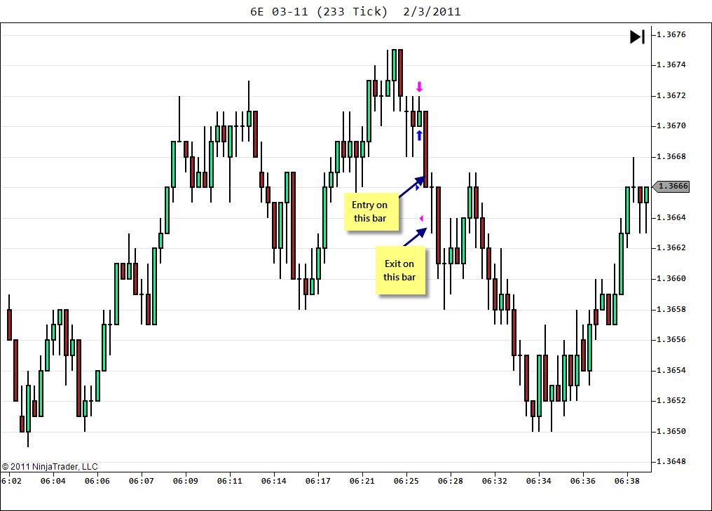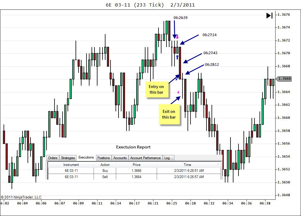 I enter and exit orders via chart trader (i.e., by moving orders on the chart.). I use Zenfire, trade 6E on 233 tick time frame using Ninjatrader v7