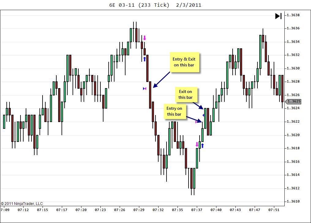 For example, during live session, when I enter long by dragging a limit order, as soon as it gets filled shouldn't ninjatrader be showing markers on the bar @ price the order was filled? The markers and arrows show up randomly couple of bars left to the actual bar I got filled.. Similarly when my stop order is filled the markers are off by couple of bars left to the bar at which price is executed.