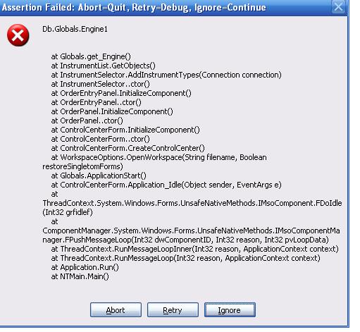 3. After click OK (again, the only choice), I got a rather length assertion message indicating failure at Db.Globals.Engine1 with the choices of Abort, Retry, and Ignore. None could get me anywhere.