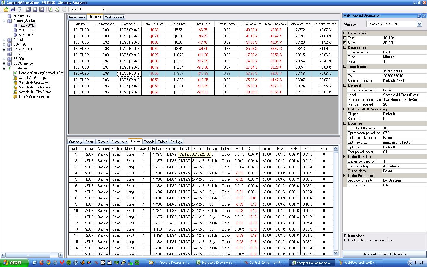 Now, NinjaTrader reproduces this, as expected, but things get a little weird when I look closer at the trades for the different periods. It seems as though the simulations don't stick properly to these date ranges. When studying the 'Trades' panel for a specific Optimisation, occasionally a trade taking place entirely prior to the start date appears to be included, and this seems to happen REGULARLY for Walk Forward trade sets!