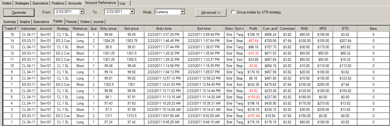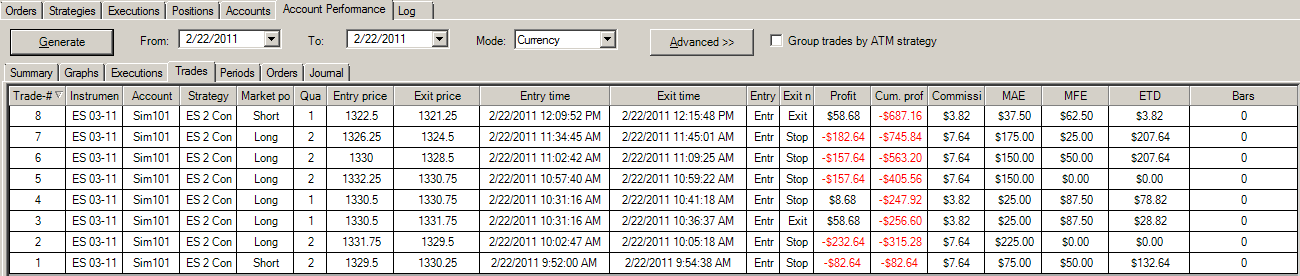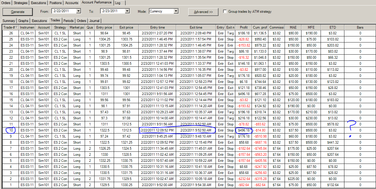 When I generate the report from 2/22 to 2/23, a trade shows up with a profit of 9 ES points. I never made such a trade. When I generate the report for 2/22 to 2/22, the trade does not show up, and from 2/23 to 2/23, the trade does not show up. What's going on?Last edited by JoshDance; 02-23-2011, 11:04 PM.Tags: None