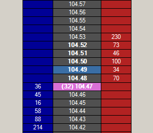 In the attached picture, you will notice that the numbers 104.47 through 104.52 are all in bold. I have set the bid and ask colors to be white, and the regular font color to be white as well. The prices that the bid and ask touch are not being set back to regular instead of bold, it appears. I have not tested this with the default scheme of black on white. Clicking the "C" (center) button refreshes the window and the bolded numbers go to normal.