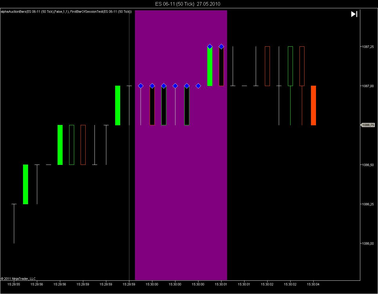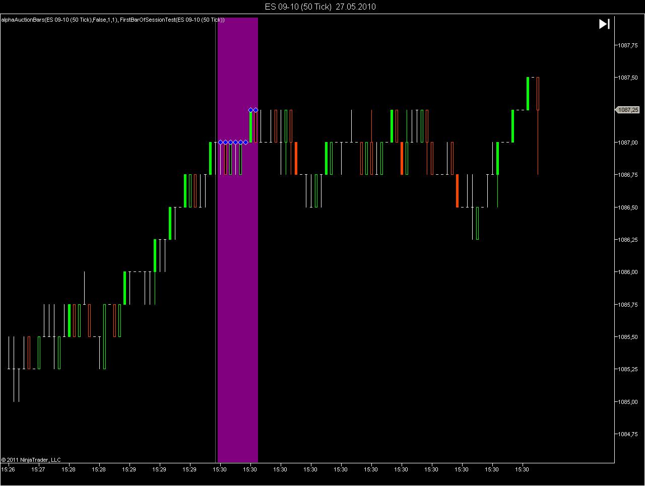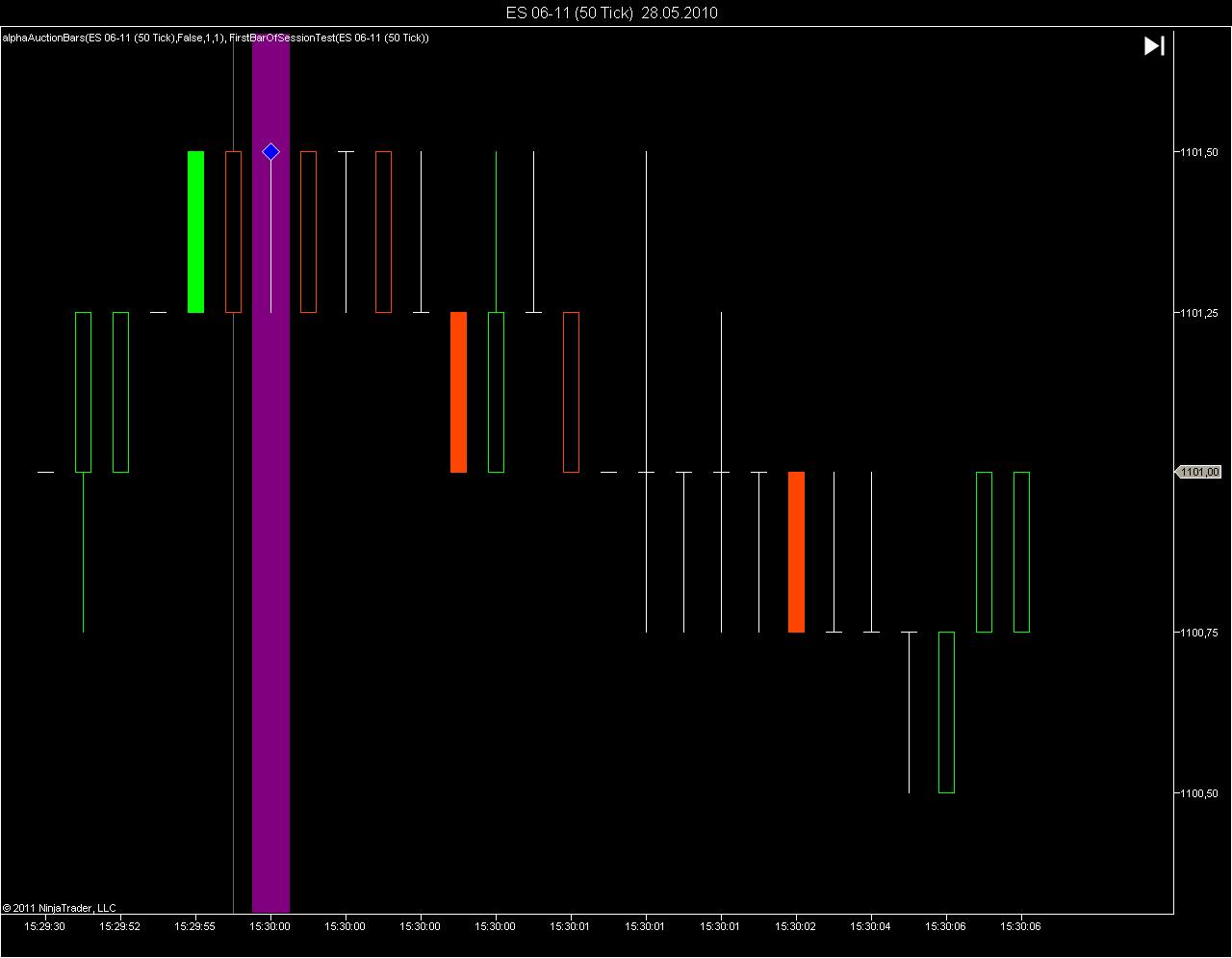 ES opens at 8:30 AM Central Time. I use a session template which splits the GLOBEX session into the night session (prior to 8:30 AM) and the RTH session (after 8:30 AM). Now if I look at the 8:30 candle (s)