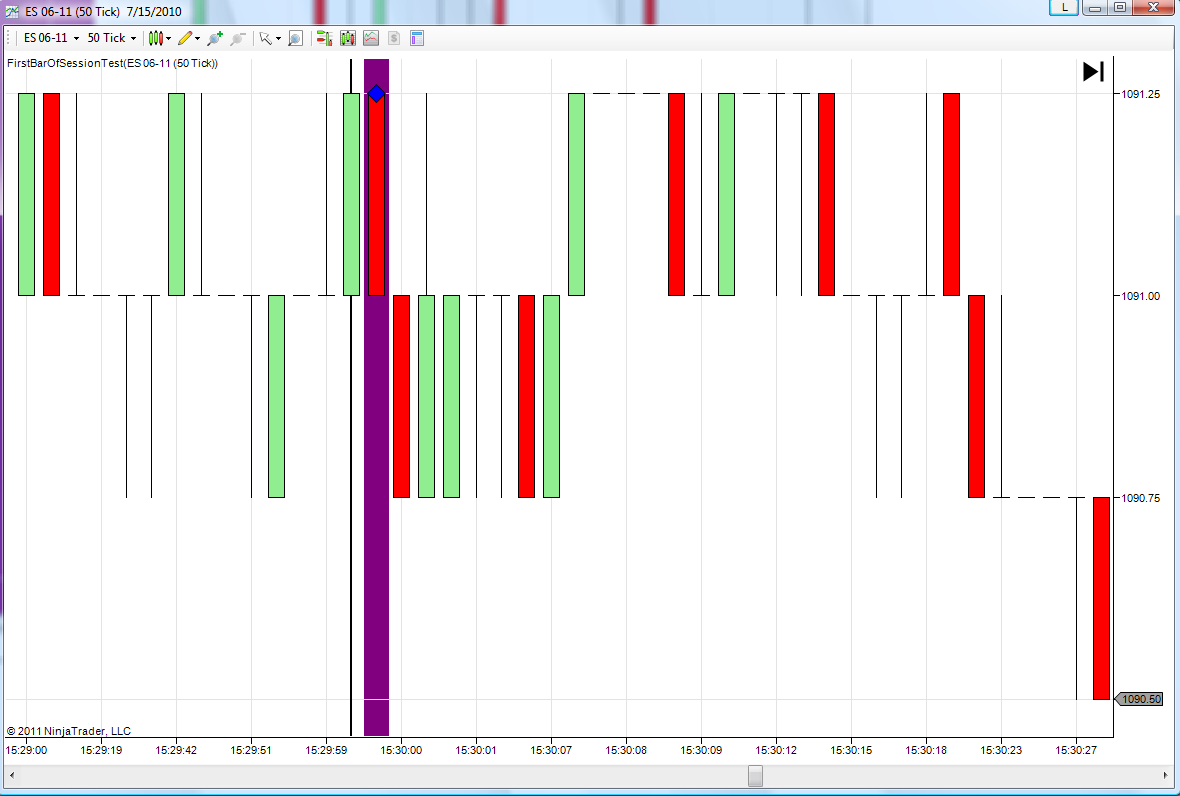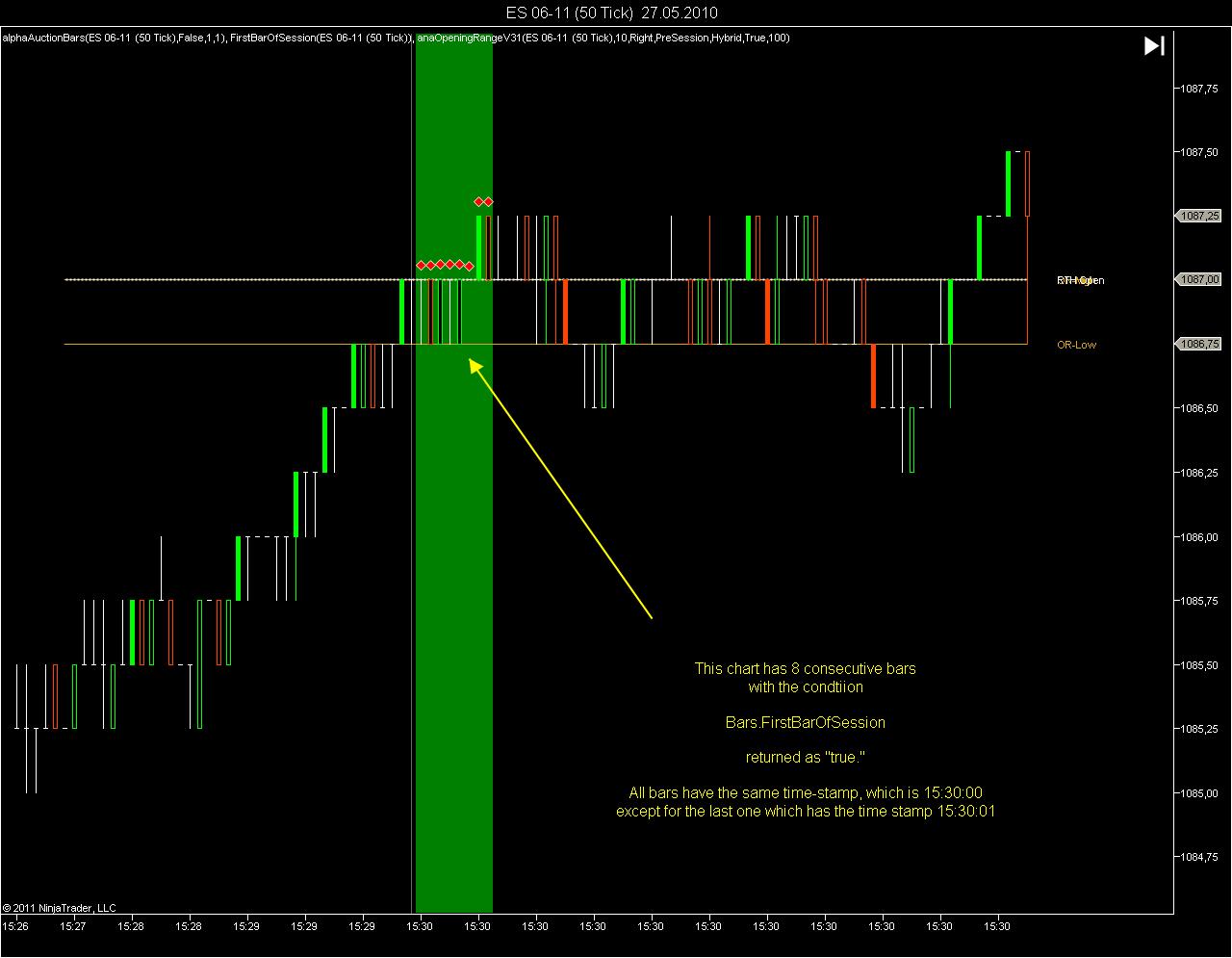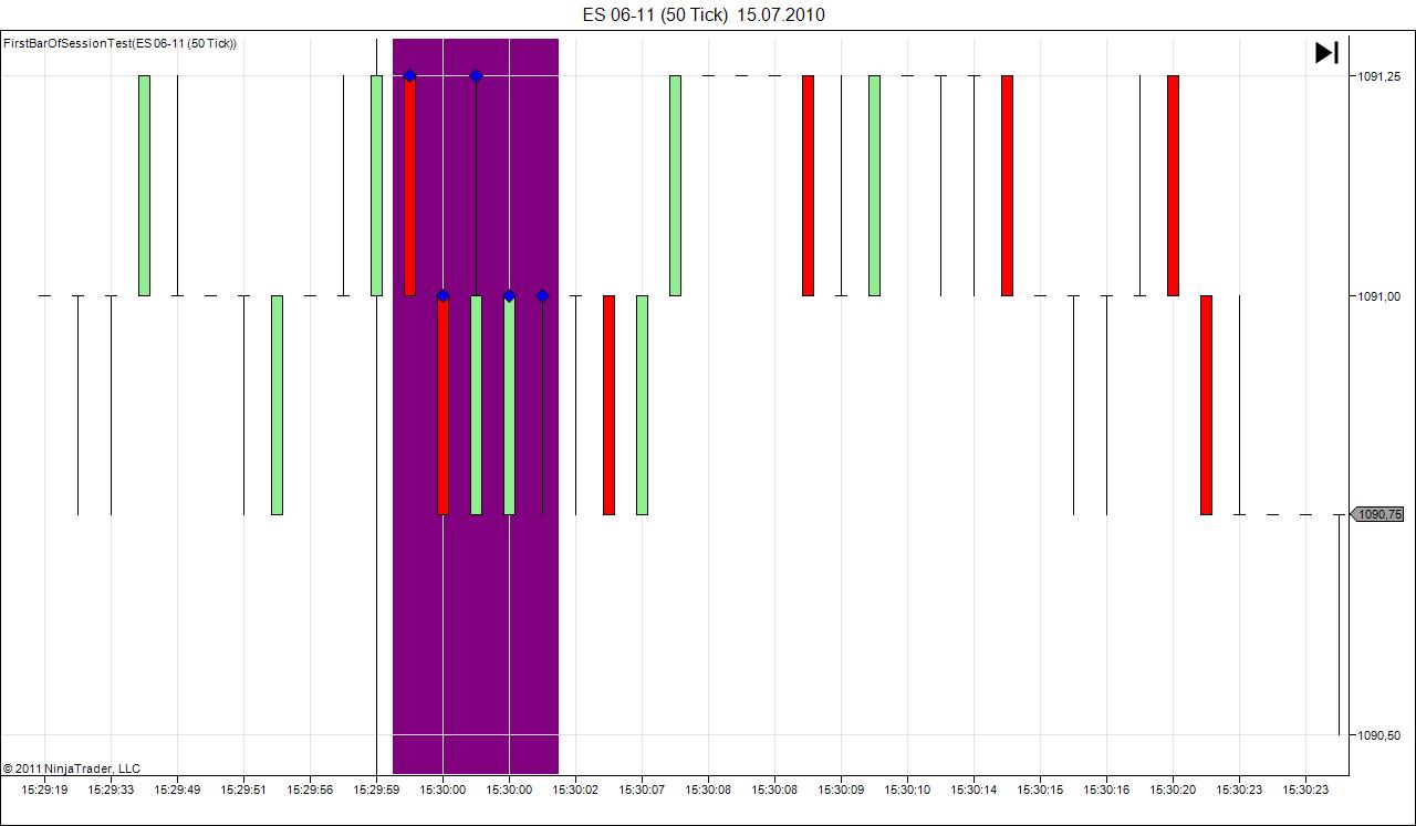 ES opens at 8:30 AM Central Time. I use a session template which splits the GLOBEX session into the night session (prior to 8:30 AM) and the RTH session (after 8:30 AM). Now if I look at the 8:30 candle (s)