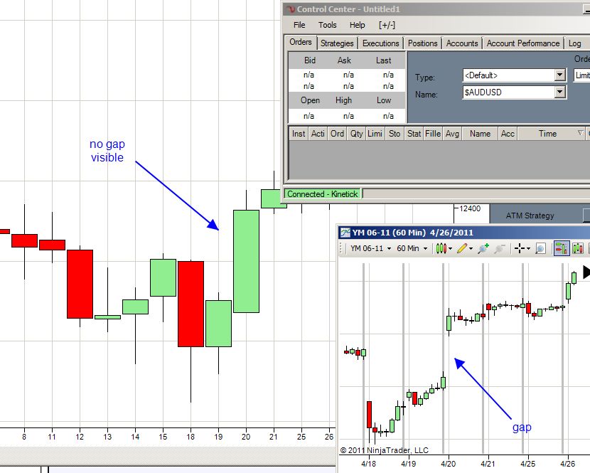For now I am fine using the connect to kinetick first or using 1440 min charts, but hey its 2011, it should be no problem to say to ninjatrader use daily bars (RTH) from kinetick and use realtime data from zenfire without any hacks :-)
