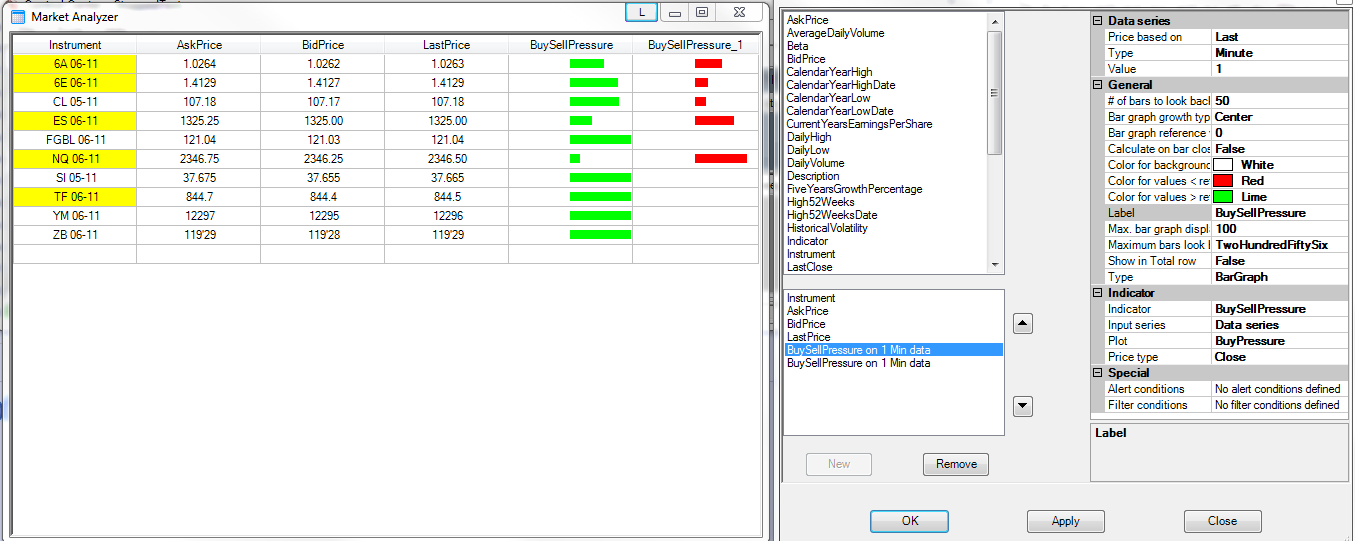 OK. NO Problem, that is what I wantOriginally posted by NinjaTrader_Jason View PostThese settings are not required to plot the BuySellPressure indicator in the Market Analyzer. OK