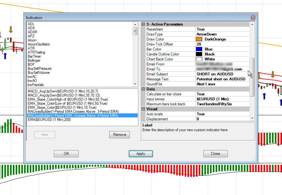 Oddly, I never had to set up email accounts in the Misc tab in the Options. I don't know how this is possible, but it worked for years. I would get an email at the address I designated whenever a crossover happened from this indicator.
