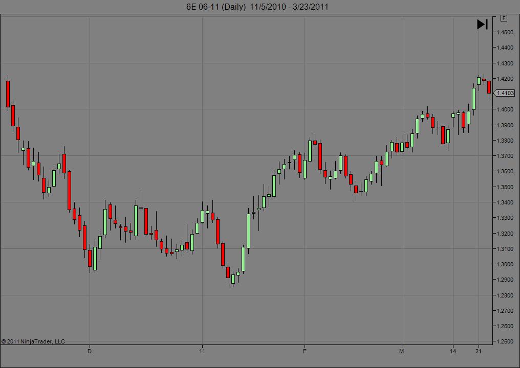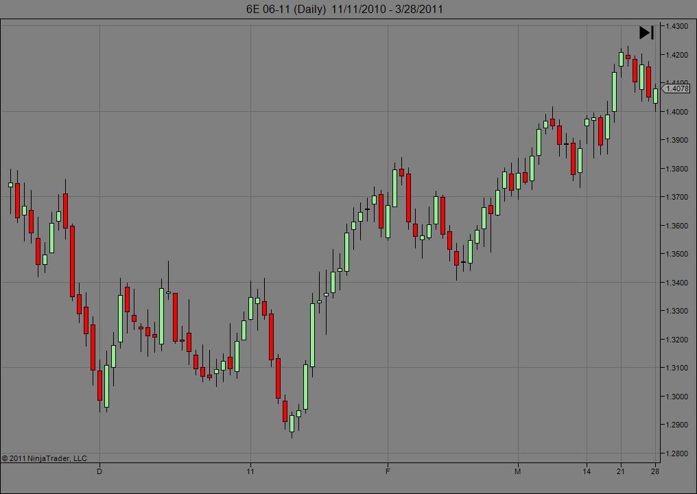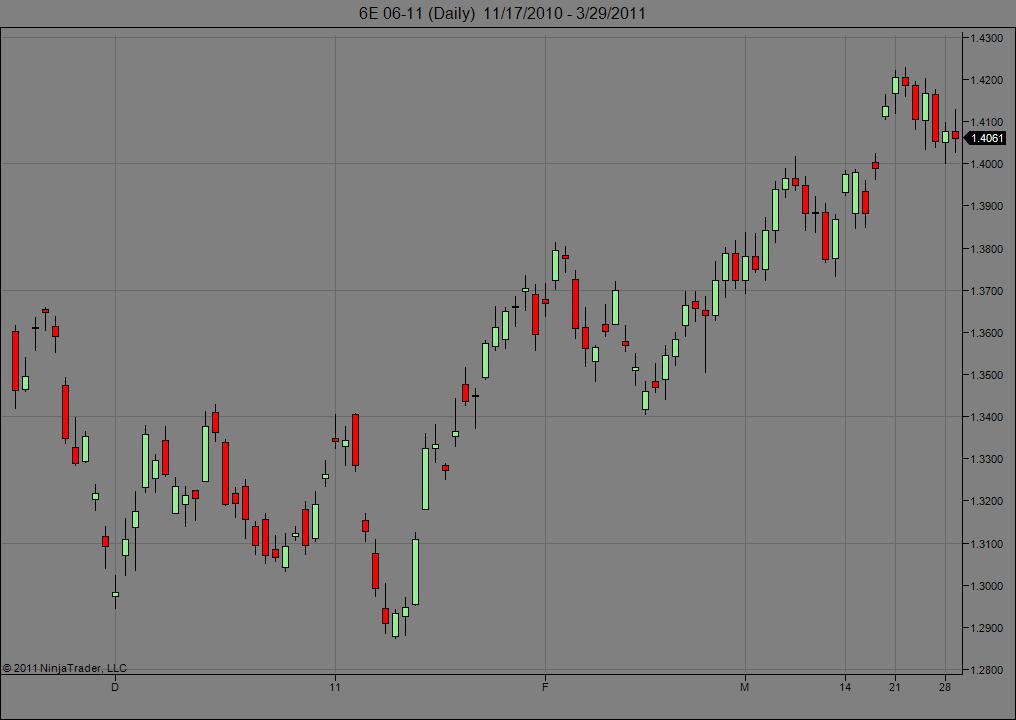 I have generated daily charts of the 6E(06-11) with both Zen-Fire and CQG data connections and consistently get "dirty" daily data, even after reloading historical data. By "dirty", I mean that the open, close, low, and high of the day are invalid. On the other hand the free Kinetick EOD connection works well and provides "clean" daily data. Hence to get both "clean" daily data and tick-level data, I have established a primary connection with Kinetick EOD and a secondary one with CQG. That worked until last night and I am getting completely unusable charts with large gaps (despite the fact that my default session template is 24/7). What am I doing wrong?Tags: None