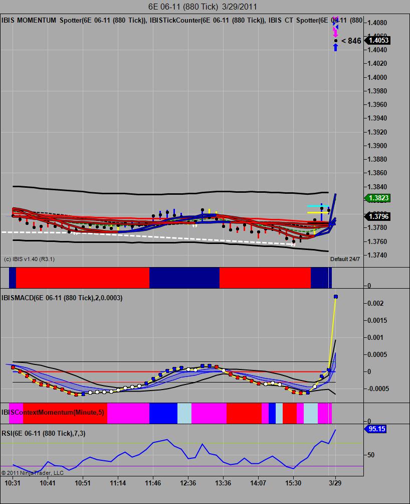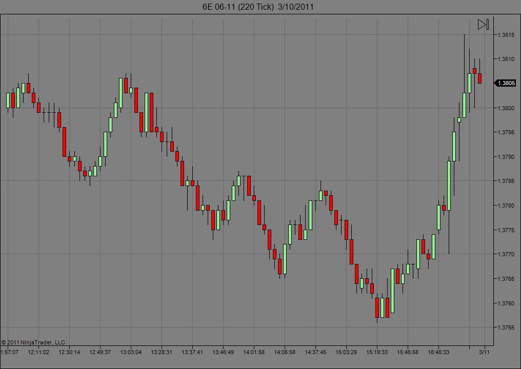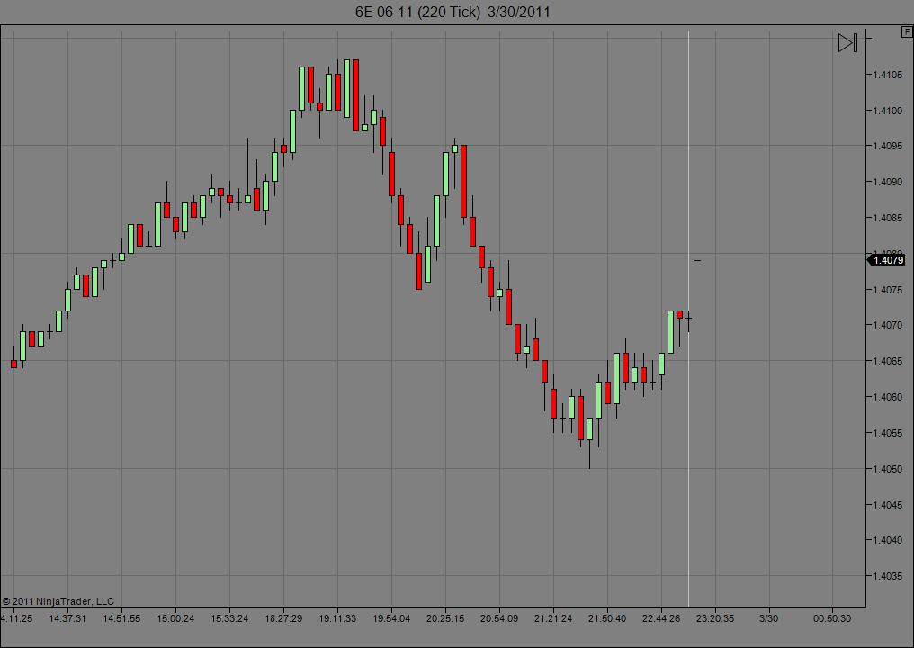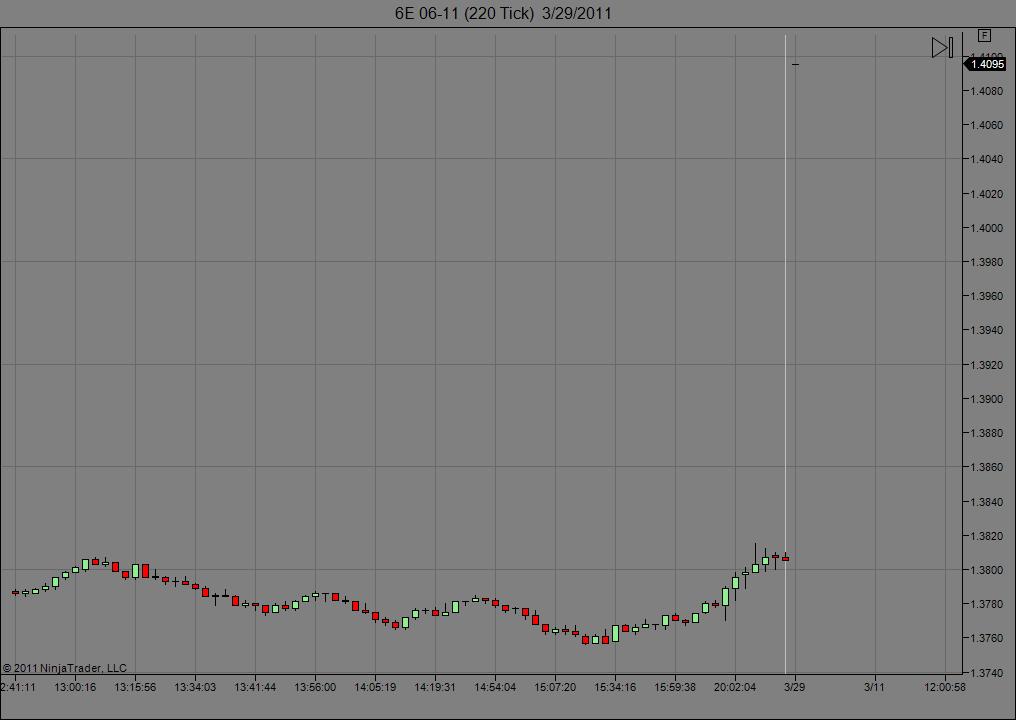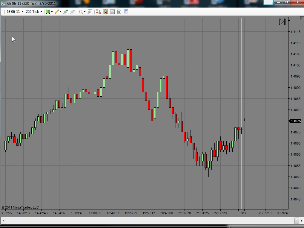 I don't know if this helps with this troubleshooting or not but I manually deleted all the folders contained under Documents\NinjaTrader 7\db\minute, Documents\NinjaTrader 7\db\day, and Documents\NinjaTrader 7\db\tick. I then established a dual conection (Kinetick EOD & CQG) and loaded a 220-tick chart of the 6E with 21 days of lookback and reloaded all historical data. The result is shown in the attached chart. As you can see the chart only displays live data and no historical data. The Documents\NinjaTrader 7\db\day folder is also completely empty, however a 6E 06-11 folder has been created in the Documents\NinjaTrader 7\db\minute and Documents\NinjaTrader 7\db\tick folders.