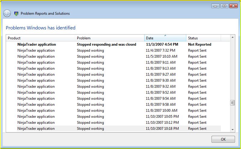 I'm running Windows Vista, and I'm now wondering if there could be some interaction with another program. I run FireFox and have quite a number of Firefox windows open. Sometimes Firefox gets too huge, taking up so much memory that it gets very, very sluggish, so I restart FireFox and it will reload the saved list of it's windows, and the problem goes away for a while. But I'm now wondering if when Firefox is using too much memory, if this could have some effect on NinjaTrader. One thing to note about the abort that is unusual is that there is no pop-up display or dialog when this occurs; instead NinjaTrader and all its windows just silently disappear from the screen.