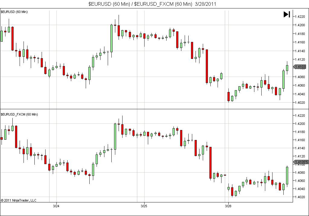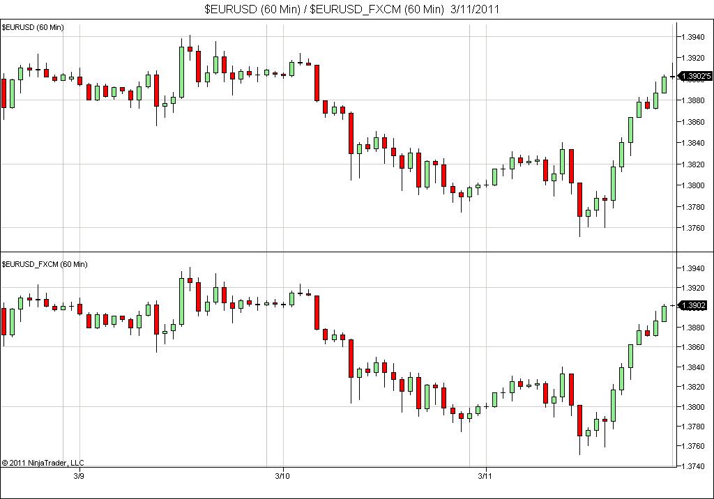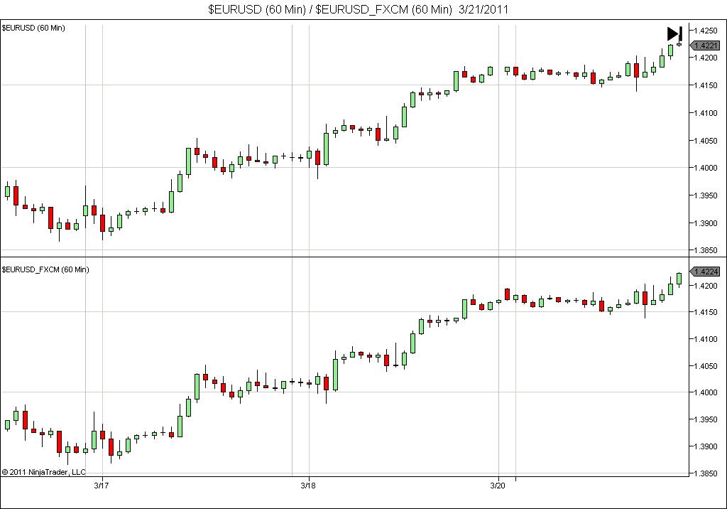 However there are problems. On my dev machine, I also collect FXCM data from DTN/IQFeed under different symbols, using the same forex session setting, i.e. EUR/USD = $EURUSD_FXCM.