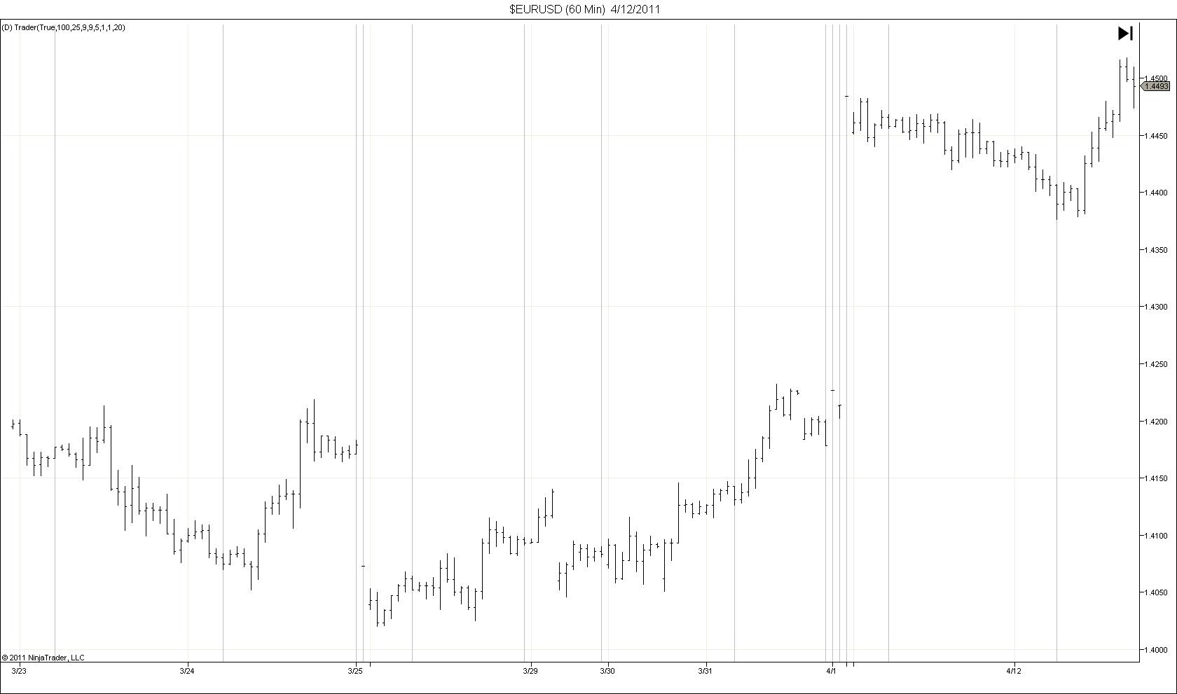 I am usually displaying 4 pips range bar in forex and that works well, but when I switch to minute bars some bars are missing ( ... 4/15). I attached image as example, you can see that some bars are missing.