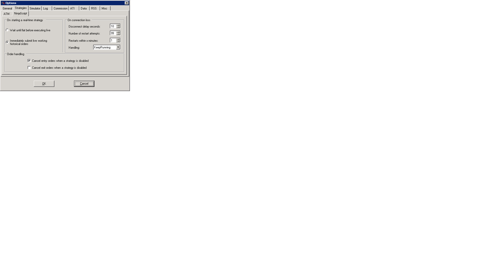 Hi Brett thanks for the info. I started the strategies running last night at the forex week opening and it woke me at 5:30AM with a "disconnect". This is the normal time for disconnects from the Interactive Broker servers - it appears that IB reserve the right to bring down any of their servers at around this time. What is remarkable this time is that NinjaTrader kept updating the charts despite the notification that it had disconnected from IB. I assume that it was perhaps the order server which had disconnected and not the price feed. In my next message, I shall post the log statements - perhaps it will shed some light on what got disconnected and how come NinjaTrader was unaffected.