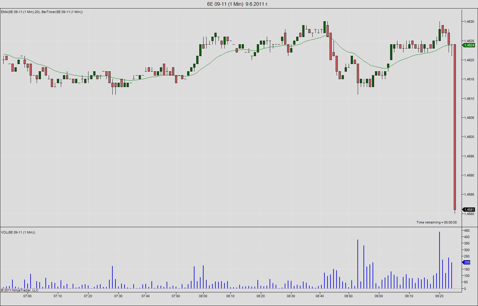 This is due to the rollover date of the currency futures. It combines real-time data from the 09-11 expiry with historical data from the 06-11 expiry. Because there is a price difference between the two expiries, you experience such a large price bar.