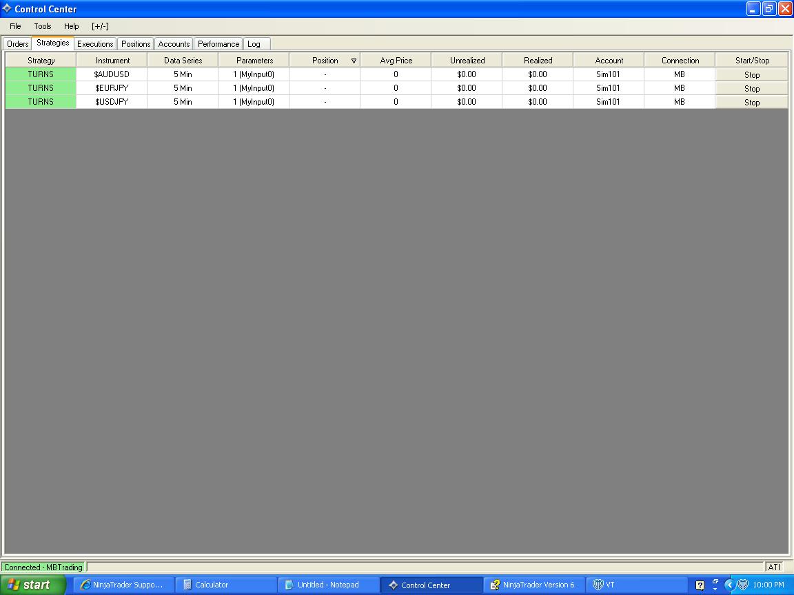 I seem to have been able to connect to a demo account at MB Trading, created a NT Strategy, and "turned on" the strategy under the "Strategies" Tab...however nothing seems to be happening. I wish to send automated trade signals to the demo but NT seems to be doing nothing at all after connecting...I have a screenshot of my strategy setups showing that they seem to be running and the connection has been made. What could the problem be here? Also should NT also be downloading tick data from MB after the connection has been made?