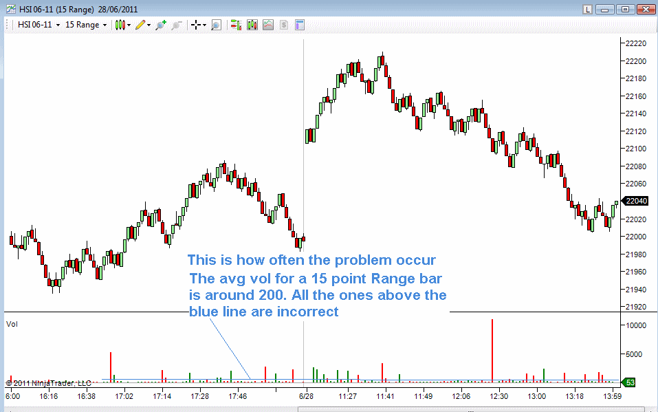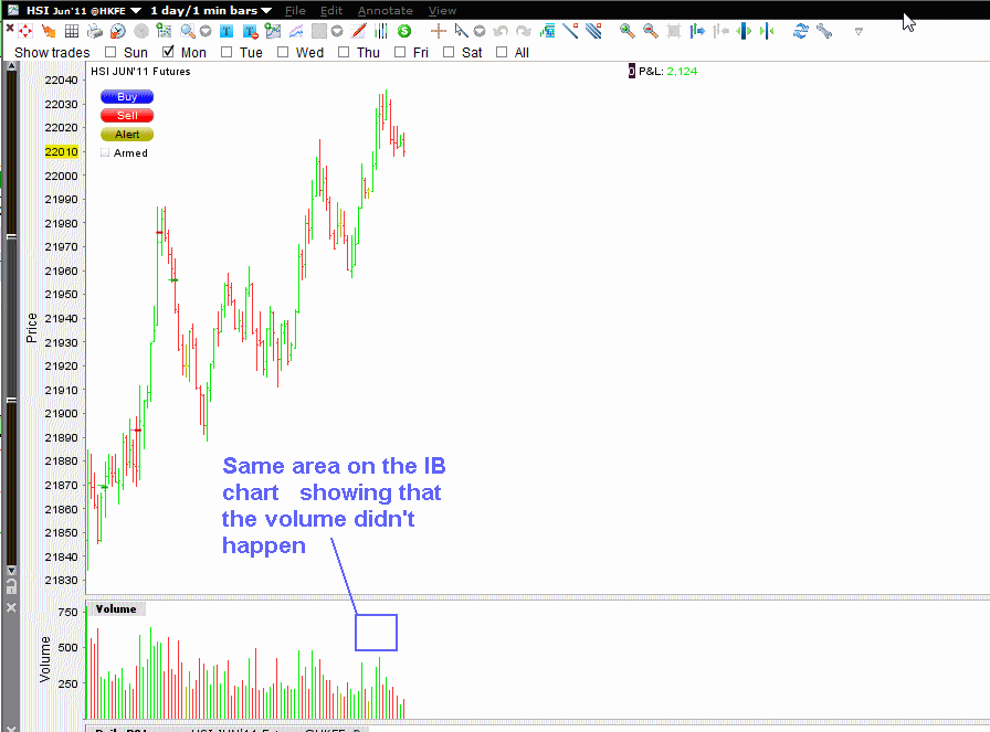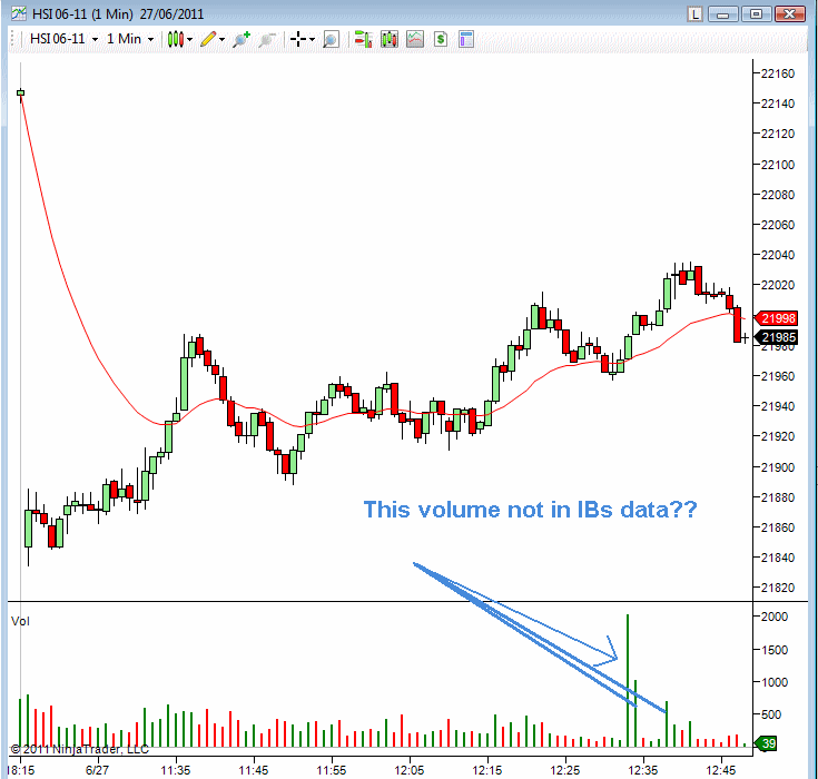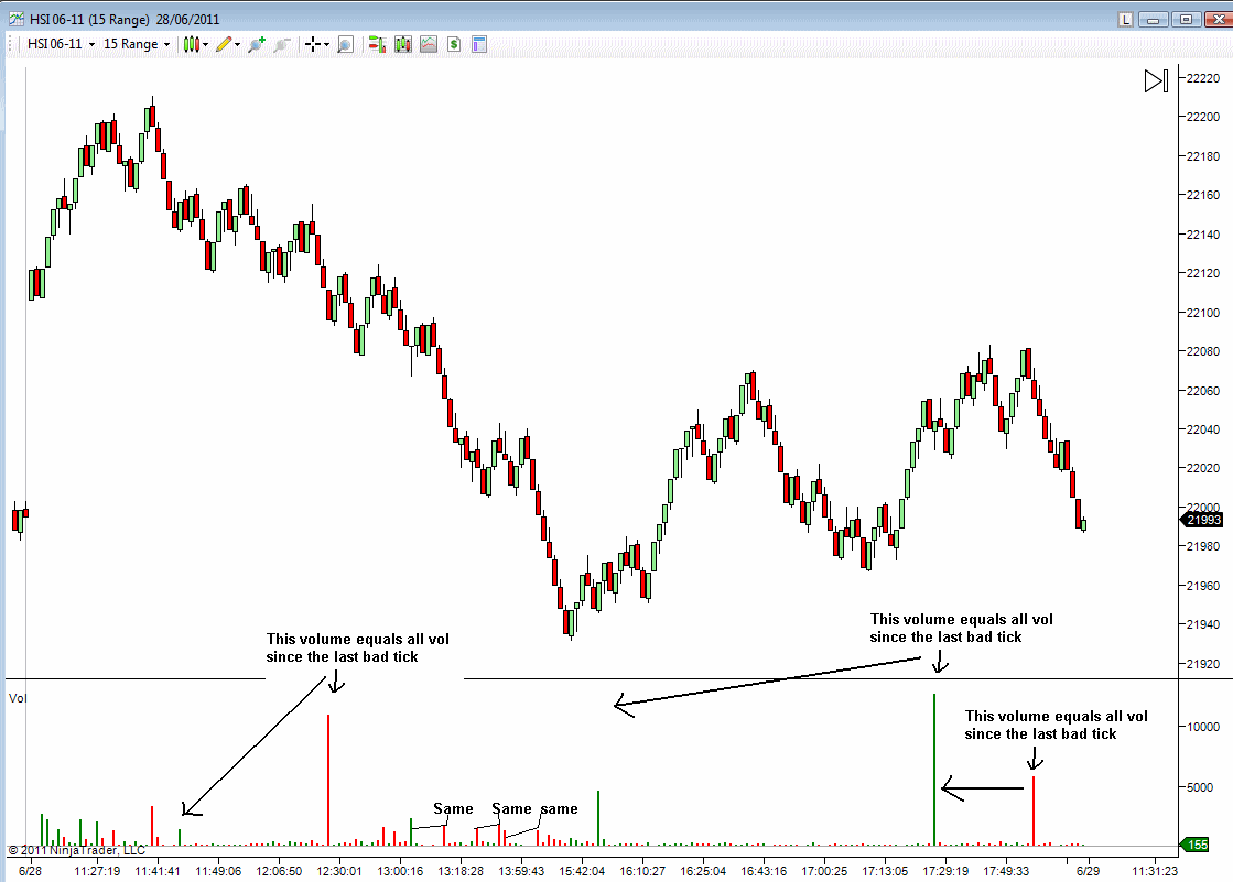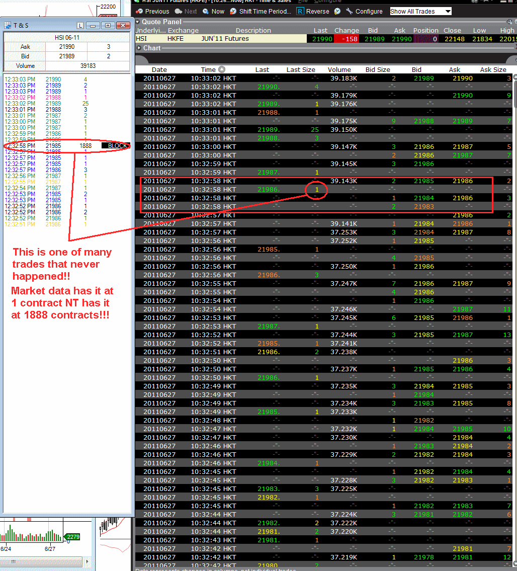 I'm having an annoying problem with NT producing very large data on Hong Kong Futures exchange for ticks that are only a few contracts. As you can see from the charts every 5 - 15 minutes Nt is showing individual trades of thousand of contracts when in fact there was only a hand full, mostly 1, contract traded.