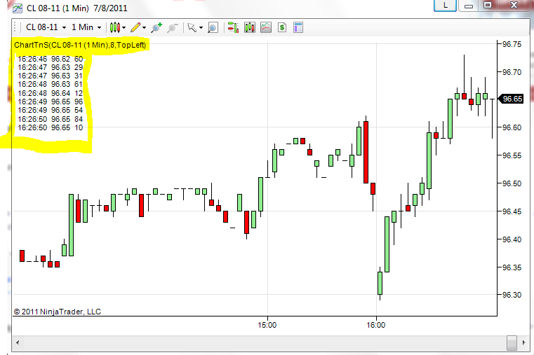 Austin,Originally posted by NinjaTrader_Austin View PostTurtle Trader, I just hacked together a scrolling T&S indicator for a chart. You can select how many lines of output you want and where the text is located. I'll continue to make refinements, but this is what I have for now.