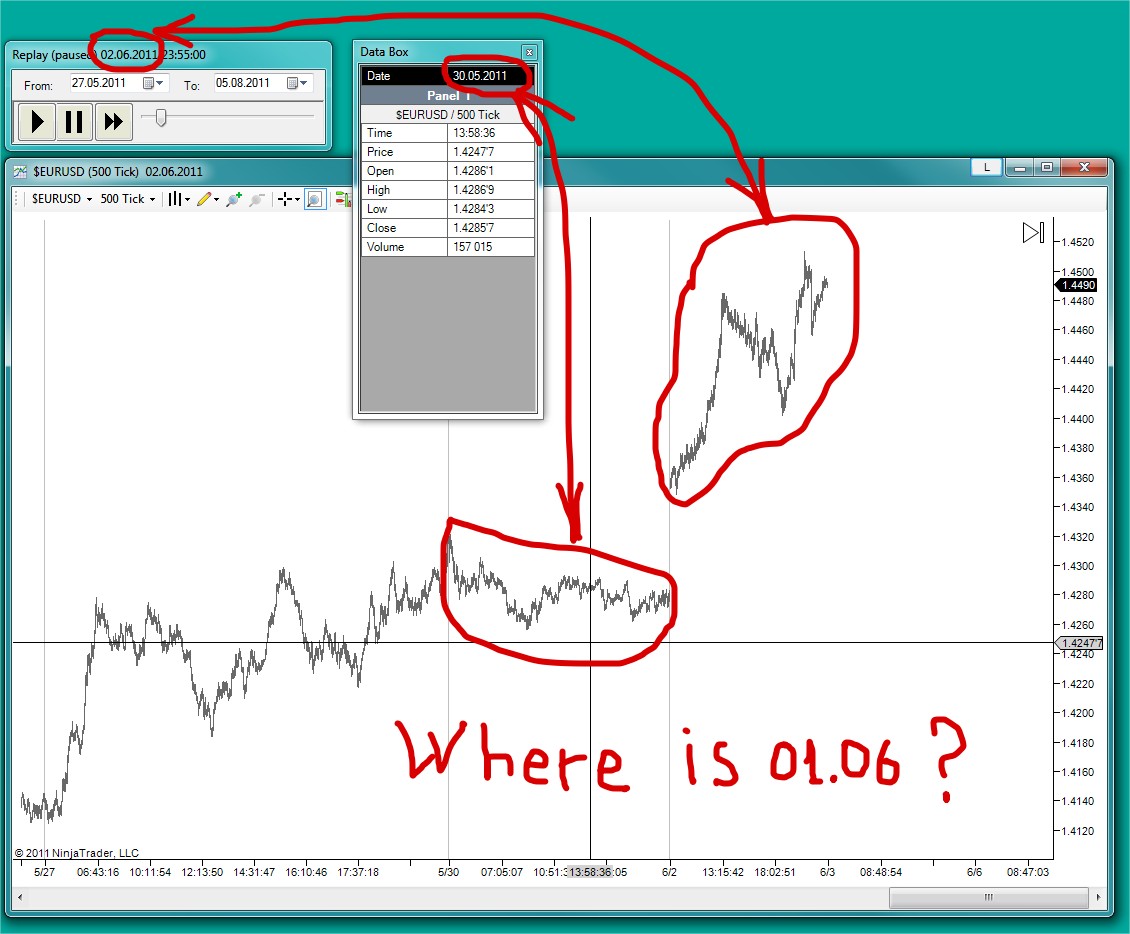 When connected Market Replay Connection, I saw 1st screenshot: some data from May, than gap and complet 01.06.2011 data (1st of June).
