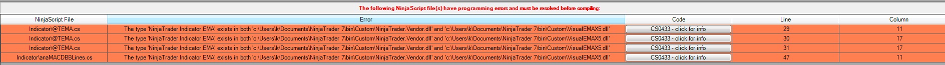 You can close down NT and then remove this VisualEMA file from the bin > custom folder so it would be loading the next time you startup. Then afterwards open any indicator, right click in it and select 'References'. Then remove the VisualEMA related entry from the list and see if you could now compile your files.