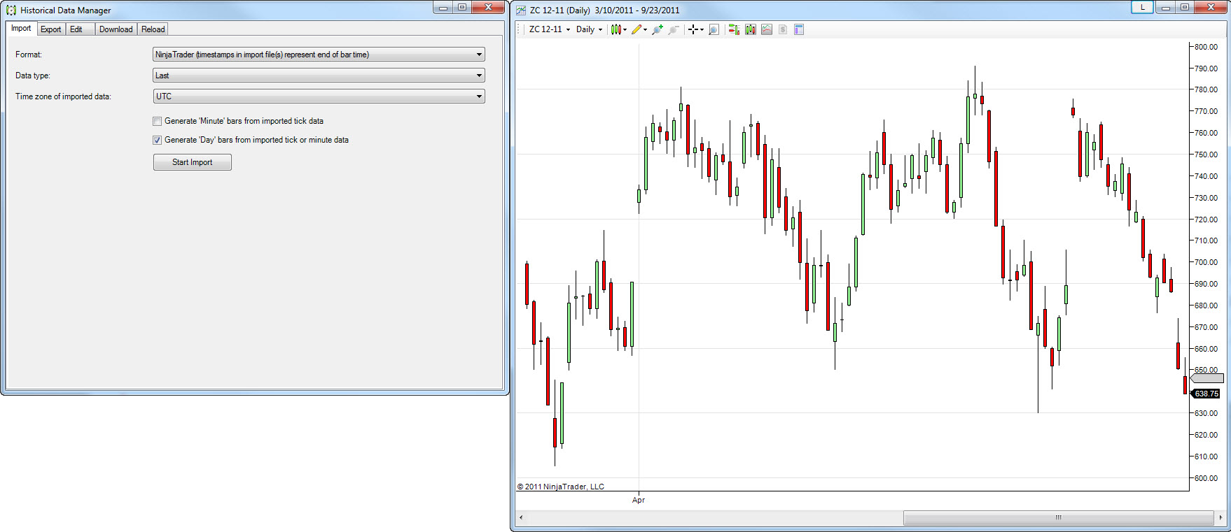 I import minute-data to generate Day-bars with it. But the resulting daily bars are not correct. As an example I use the December Corn Contract (ZC 12-11).