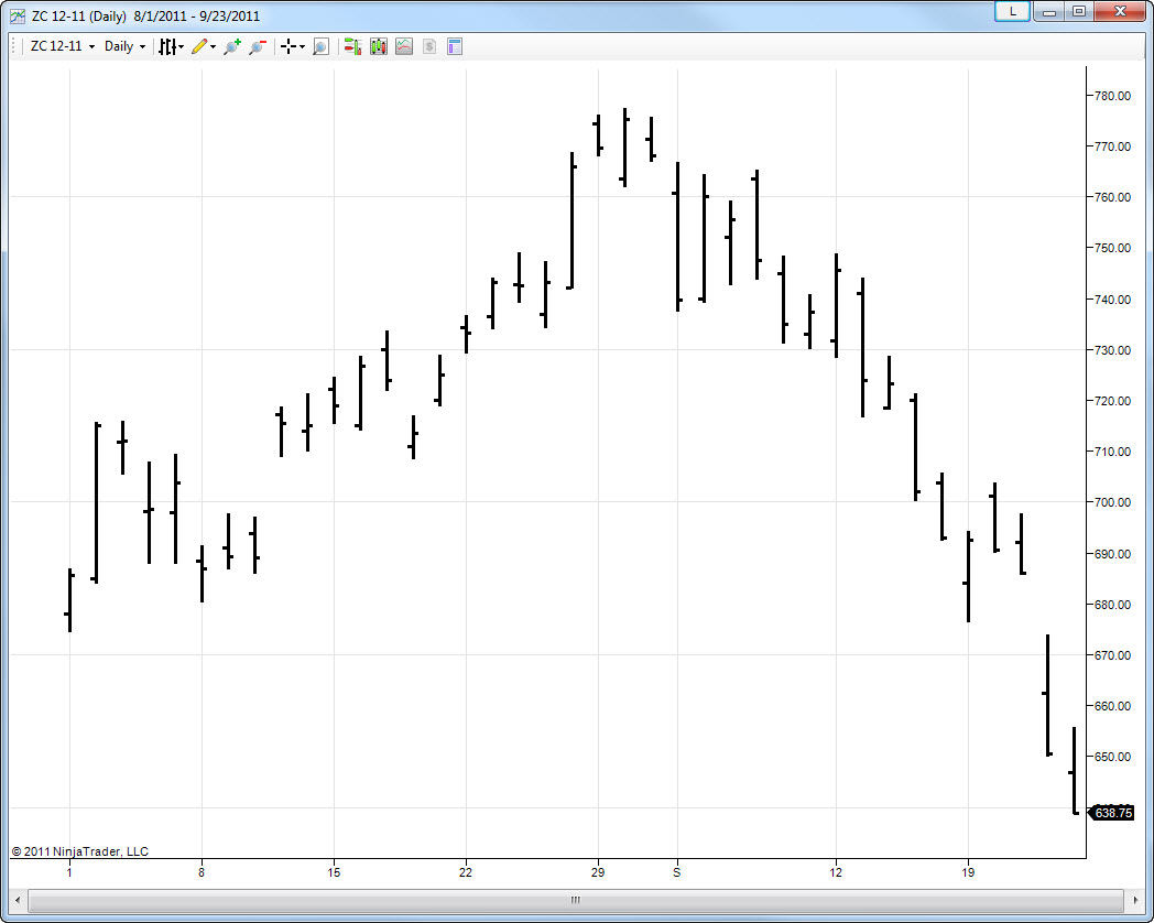 At the picture you can see 3 charts. They all contain daily ETH data for the ZC December contract from 08/01 - 09/23. The first 2 charts in the row are a CME chart and an IB chart, they are identical. The 3rd one is an NT chart, which is different.