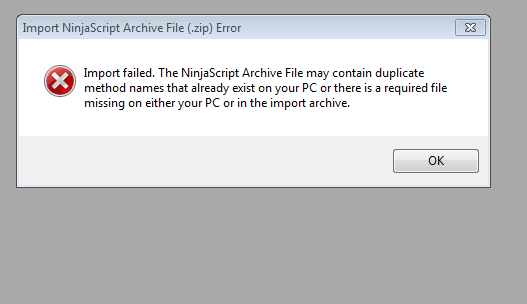 Best is to work with the author or vendor of the script. That is a generic message that means the import failed, as doing so would lead to programming errors in your NinjaScript environment.