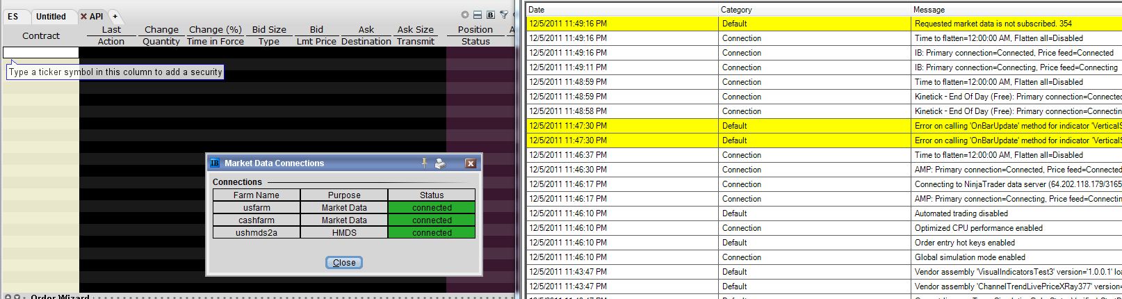 Now in the IB market data connections TWS is ok as you can see with the market connections. I have uninstalled/reinstalled TWS twice. My subscriptions to IB are up to date and I can get quotes in the IB TWS ok. So not sure where to go from here. I tried to repair the database as well. I have been in contact with IB who say it's ok from their end. I did install a later version of the TWS and then realized this may have caused the problem so then uninstalled that and reinstalled Build 917.8 from the Ninja link provided.