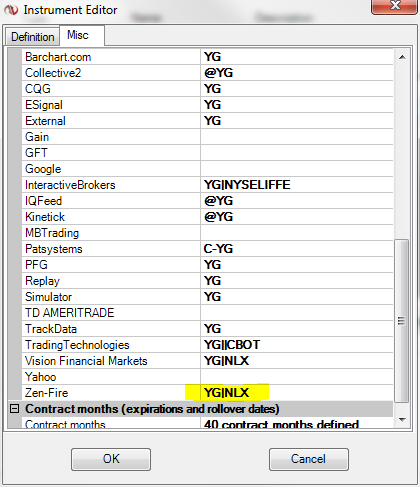 However, when I recently tried to load a new chart for YG with Zen-Fire connection, it always came up with an error message of "Error on loading chart data for "YG 02-12" Nyse": NinjaTrader data server does not support this instrument, no data available."