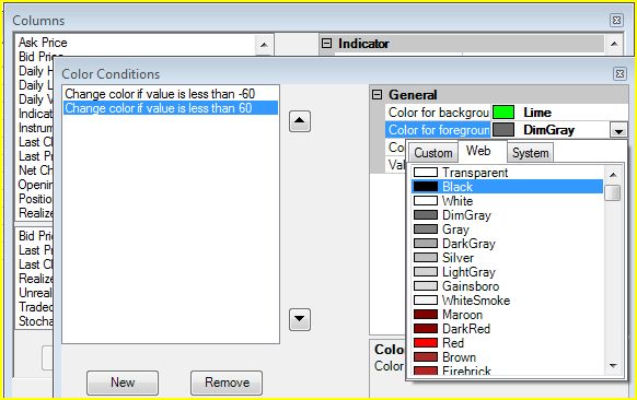 In setting a color condition for a column of the Market Analyzer, I found that if the foreground color is set to other than Black, it cannot be set back to Black, and when this is attempted, it sets the background color to white instead. (See before & after screen shots.)