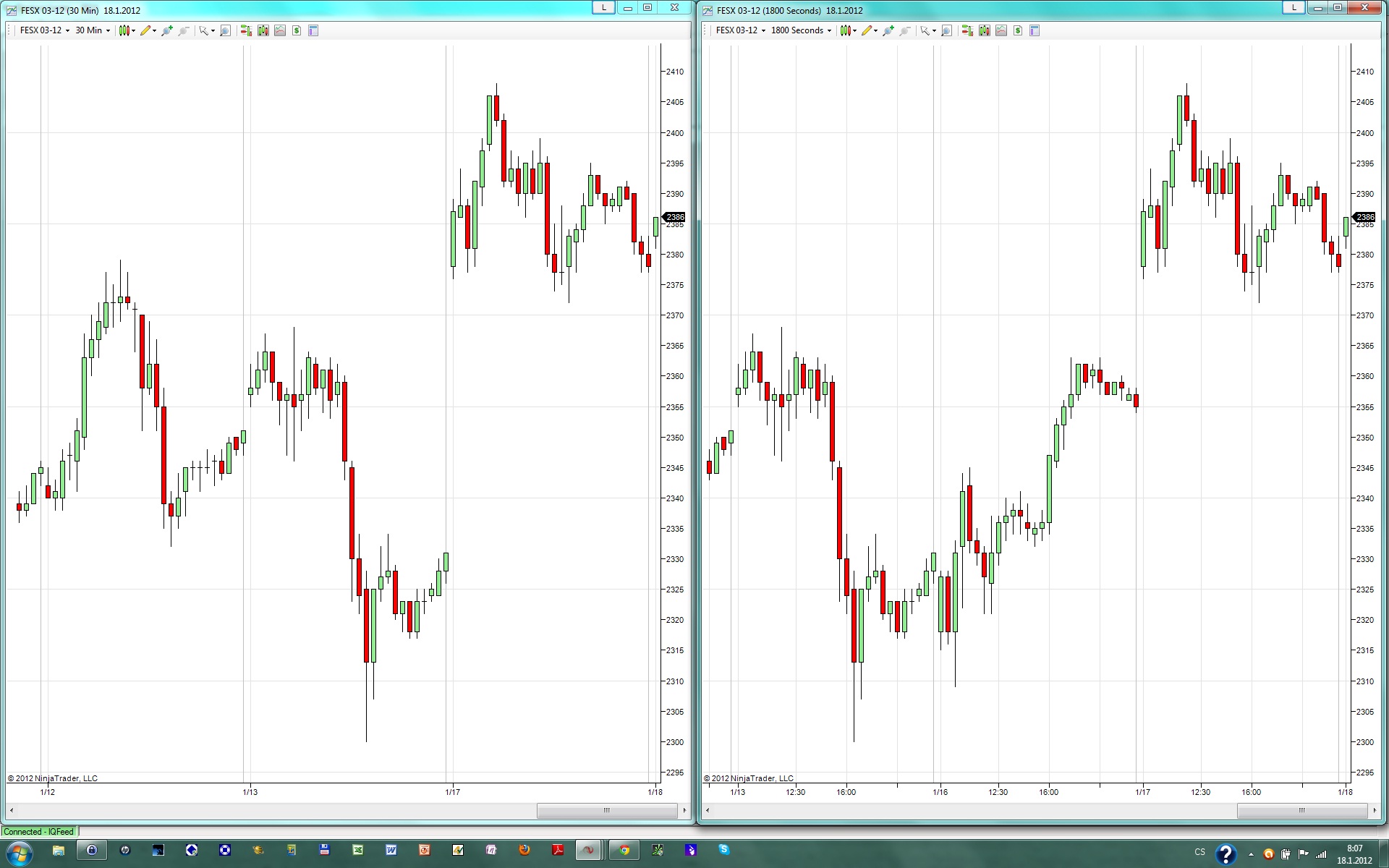 I have been having problems with correct loading of minute charts (ranges, seconds, volumes etc. are OK). I am unable to load correctly a 30 minute chart when launching NT7 (ICQFeed), it has some days missing (in a range of 5 days for example). I need to update the chart several time using various "actions", like changing the timeframe, changing the number of days, changing the session template etc.