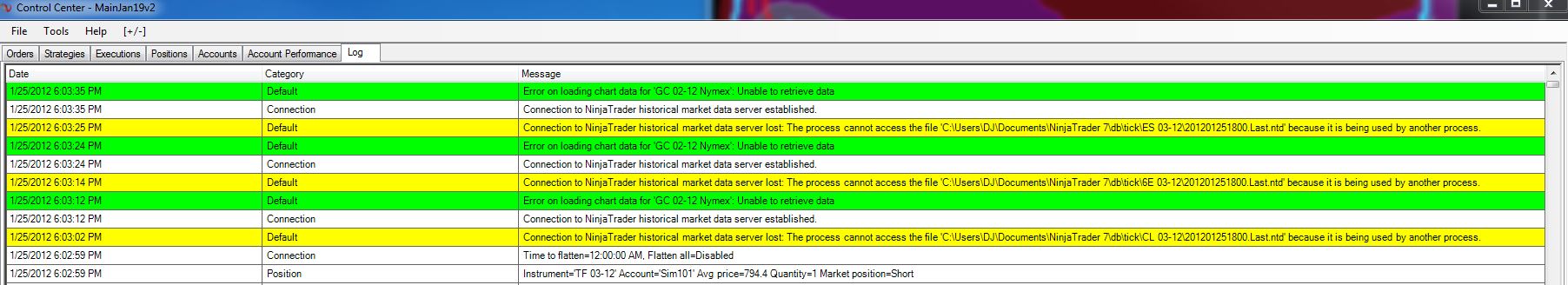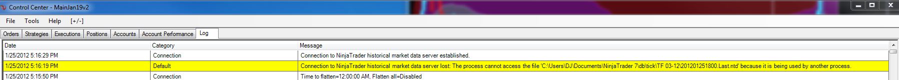 2012-01-24 17:18:40:679 ERROR: Connection to NinjaTrader historical market data server lost: The process cannot access the file 'C:\Users\DJ\Documents\NinjaTrader 7\db\tick\GC 02-12\201201241800.Last.ntd' because it is being used by another process.