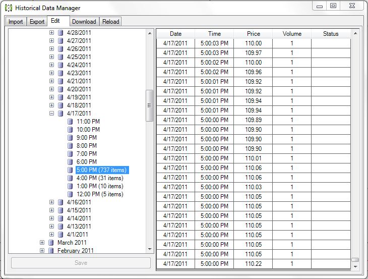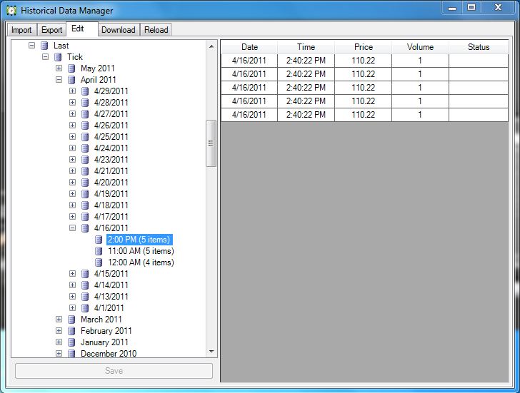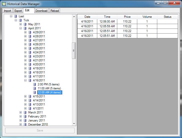 I've seen all kinds of weird issues. I've seen times where the Bid equals the Ask for minutes straight. I've seen times where the Last bounces between two prices for easily over 1000 bars all on the same second. I’ve also tried to export a moth of data (using the Historical Data Manager) 1/1/2011 – 1/31/2011. It will export part of the first day in February. How can all of this be?