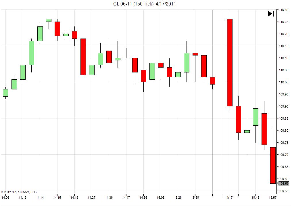 You will notice that the price jumps to Sunday's opening price which is also incorrect. Look at the screenshot of Sunday 4/17 (Historical Data Manager). You will see that there is data before the open. I didn't grab a screenshot, but all of them are 110.22. Right at 5:00 PM (the real open) there is one entry of 110.22; then they are all "normal" after that.