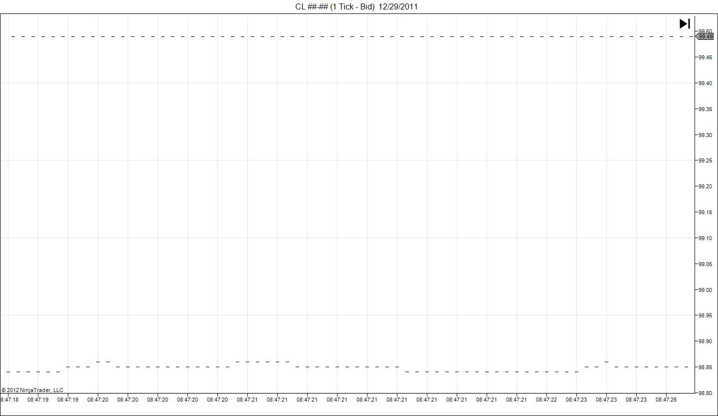 I attached some screenshots of an issue I experienced when testing with my tick data. This is CL ##-## (though the error is exactly the same when I pull up the contract month). The Bid bounces/alternates in a range of 50-60+ points all within the same second. It actually does this at random throughout the historical dataset (for that day). It usually lasts for about 15 minutes worth of historical data. The top price remains flat while the bottom price fluctuates.
