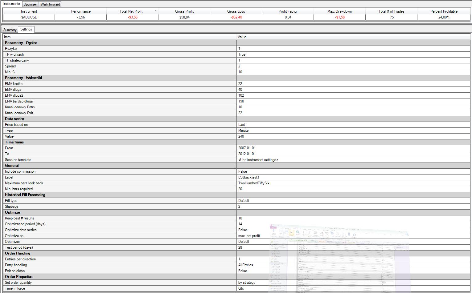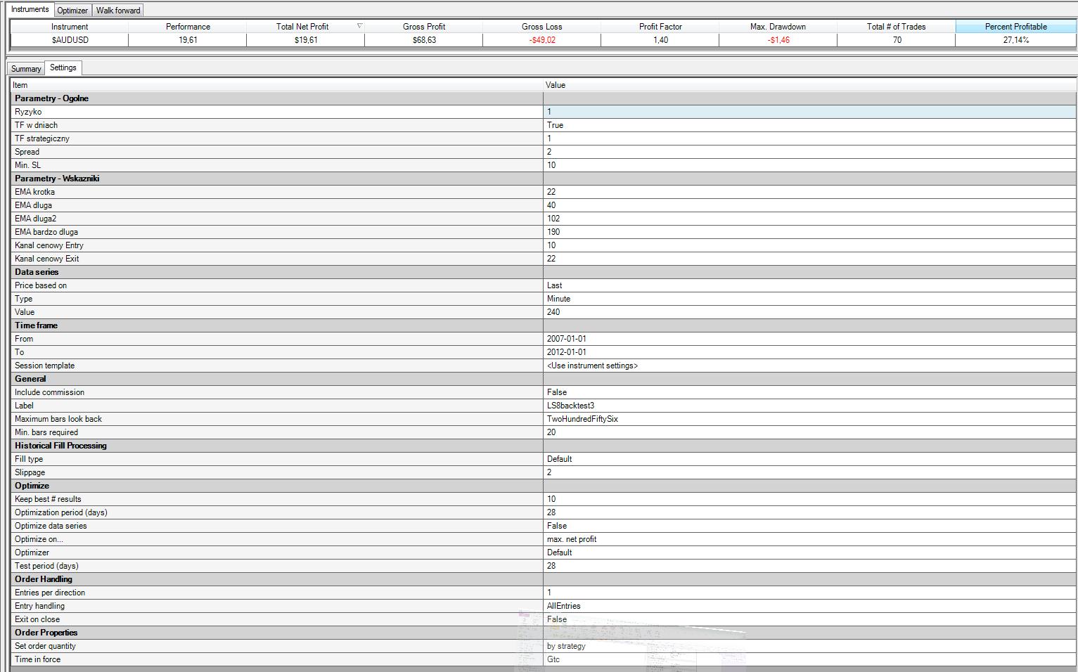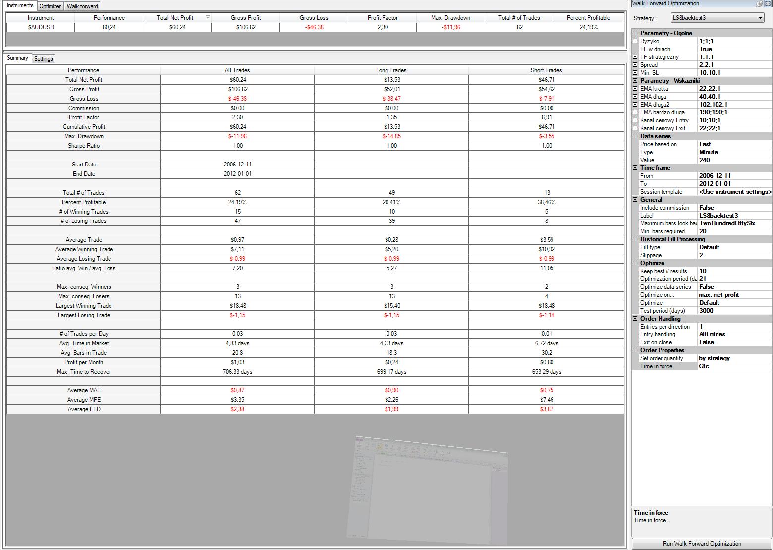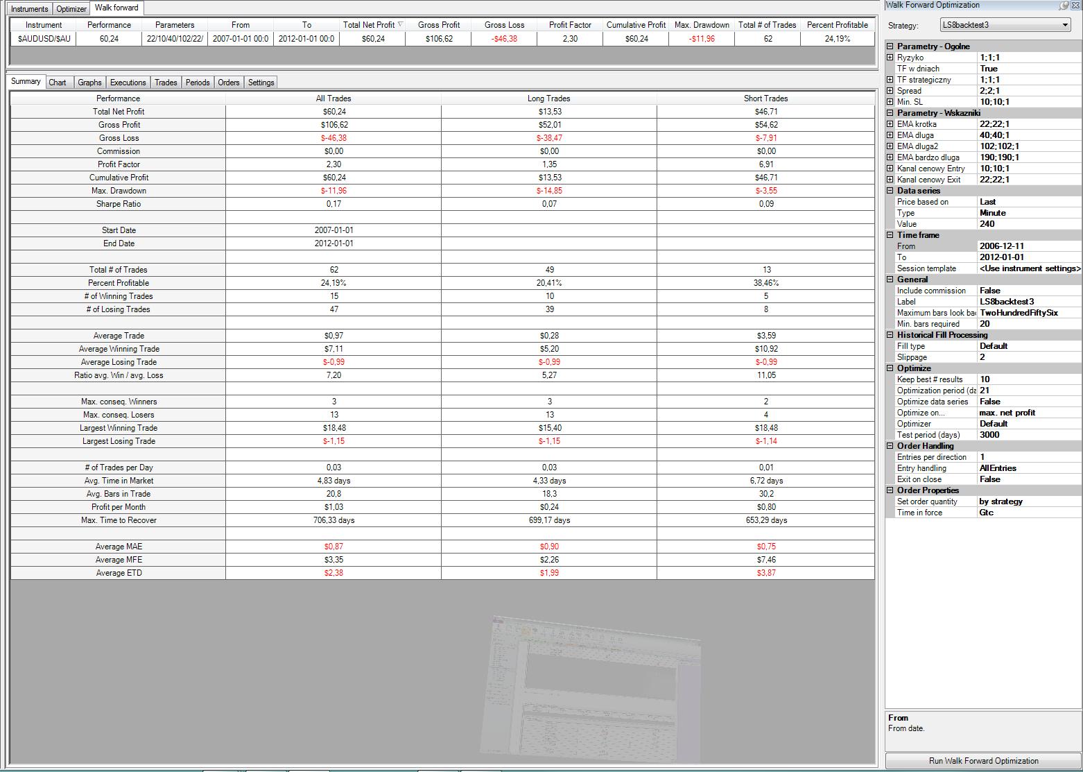I was working on NT for a while. I was performing backtest and optimizations and everything worked fine. Now I decided to take a closer look at walkforward. Walkforward is nothing more then optimization and backtest (2 in 1) so I decided to do a simple test of it first. I am presenting a case here which is my test if walkforward works ok.
