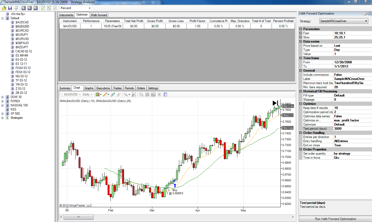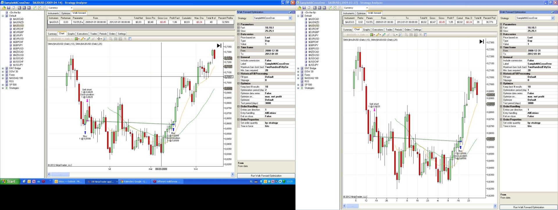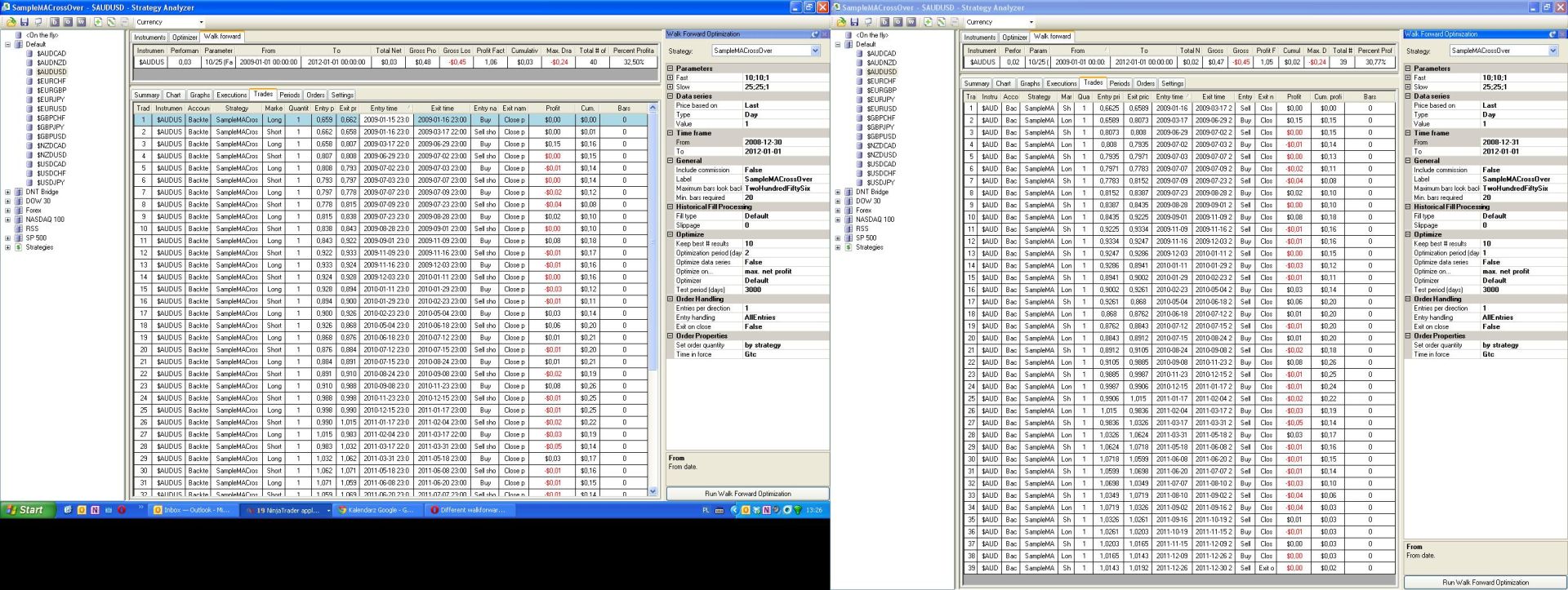 1. When I check SMA 10/25 cross on the instrument chart or in the backtest I can see that there is no trade signal on 1/15/2009 and 1/16/2009. Right signal is on 1/19/2009 only. I am wondering why backtest in walkforward acts differently.